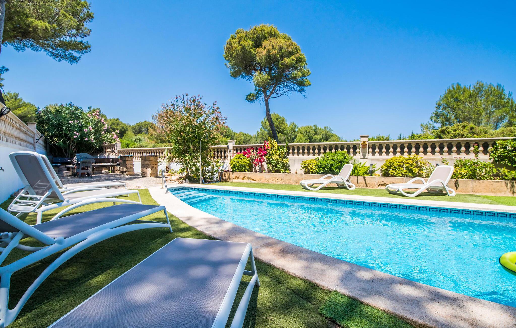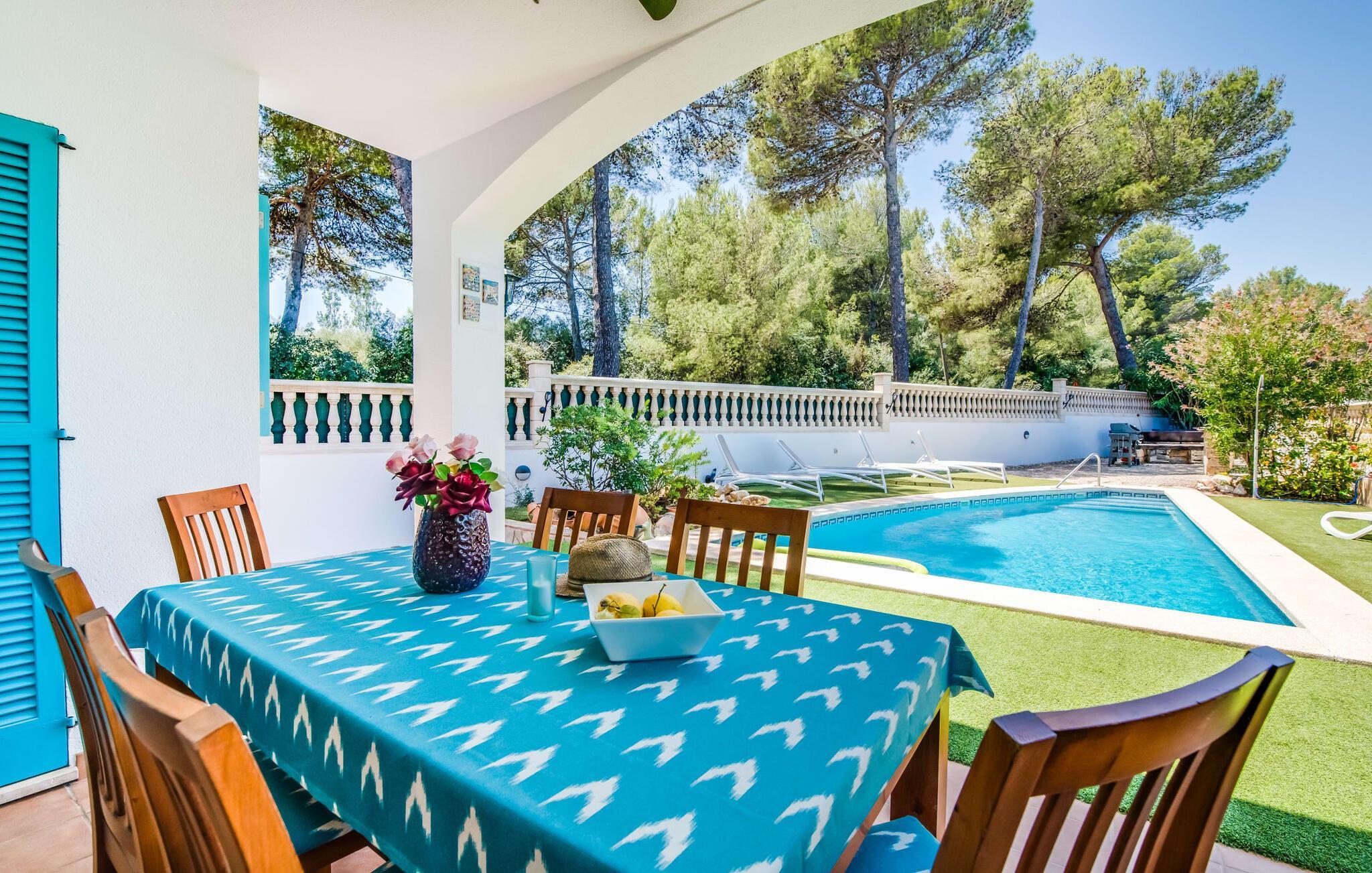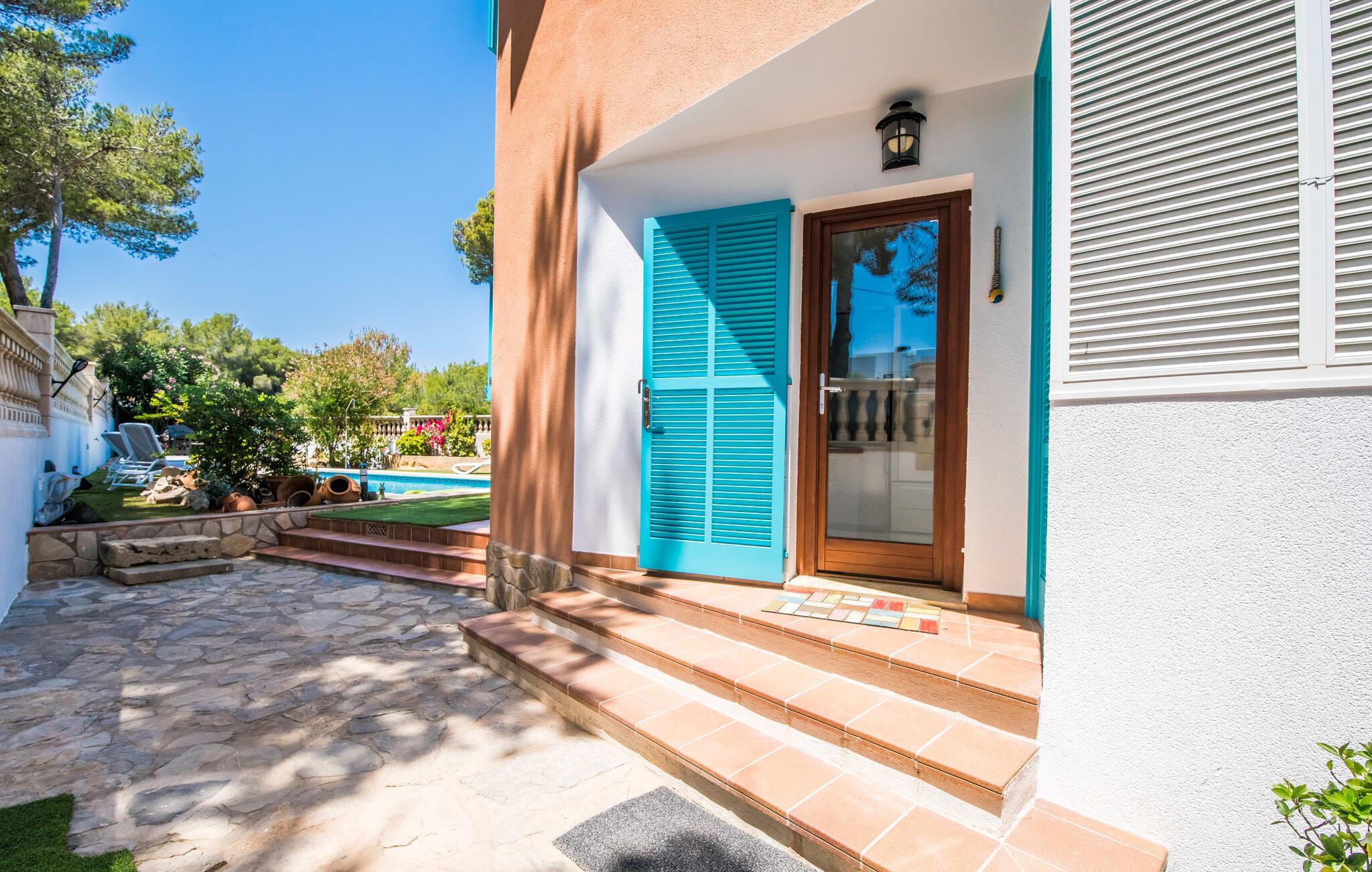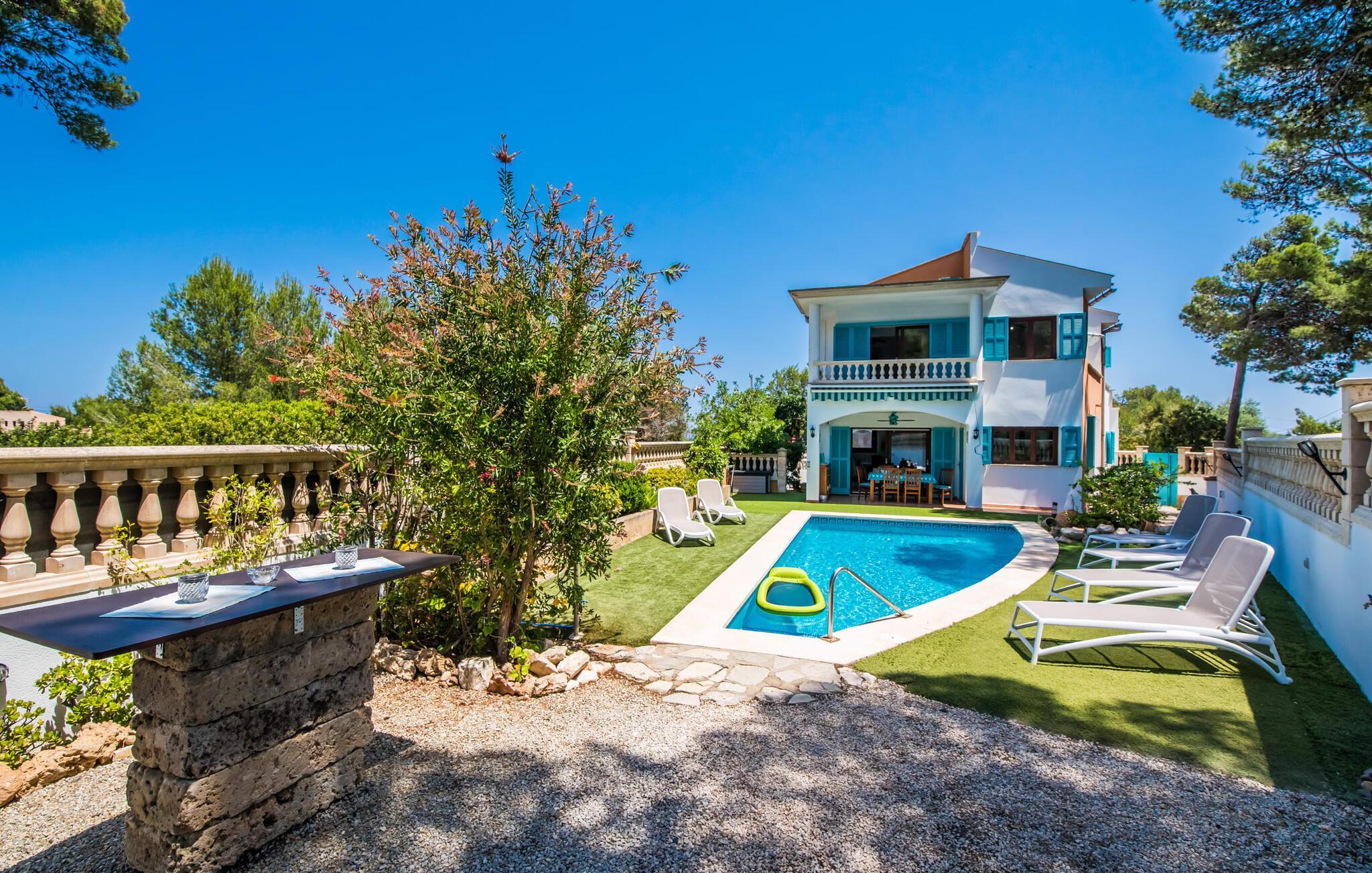 Die Lage ist fantastisch: so nah am Meer, dass man es sogar vom Balkon aus sehen kann; Ein Spaziergang zum Wasser dauert nur wenige Minuten. Die Villa „Punta Blava“, erbaut in einem typischen Einfamilienhaus-Wohngebiet, weiß gehalten und mit Fensterläden, die im gleichen Türkisblau erstrahlen wie der Pool im Garten. Das Haus an der Ostküste Mallorcas verfügt über ein gemütliches maritimes Ambiente und bietet besonders für Familien mit Kindern viel Komfort. Die Highlights: der Swimmingpool mit Kunstrasen und Liegestühlen drumherum, die überdachte Terrasse und der Grillplatz mit Paella-Pfanne. Für die Kleinen gibt es im Vorgarten eine Schaukel.