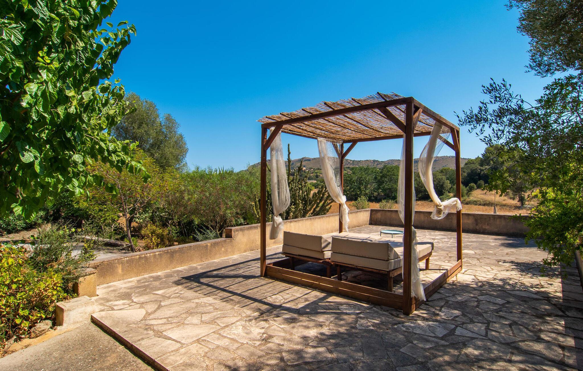 In der ruhigen und abgelegenen Umgebung der Villa „Sa Bogura“ können Sie eine bezaubernde Umgebung genießen und sich im wahrsten Sinne des Wortes zurückziehen. Eine kleine Straße zur Villa führt Sie zu diesem großzügigen Anwesen, dessen rustikales Ambiente besonders bei unseren Gästen beliebt ist. Schon bald nach Ihrer Ankunft werden Sie feststellen, dass dies ein Ort ist, der rundum Entspannung bietet. Hier können Sie Ihren Urlaub in typisch mallorquinischer Atmosphäre genießen. Der Außenbereich ist geprägt von großzügigen Terrassen, urigen Treppen, Nischen und Mäuerchen sowie allerlei mediterranen Pflanzen. Für die Kinder gibt es sogar eine Rutsche und eine tolle Baumschaukel. Der etwas abseits gelegene und über Stufen erreichbare Pool bietet einen traumhaften Aufenthaltsort. Der Pool ist zwischen 1,20 m und 1,80 m tief und über eine Leiter erreichbar. Liegestühle und Sonnenschirme auf der Holzterrasse sind perfekt für Sonnenanbeter, die hier am Mittelmeer nach Herzenslust entspannen und den Alltag weit hinter sich lassen können. Und das praktische Außenbad macht es einfach, den ganzen Tag im Freien zu verbringen. Auf einer der hausnahen Terrassen mit großem Esstisch können Sie entspannt sitzen und entweder ein erfrischendes Getränk genießen oder in geselliger Runde Mahlzeiten feiern. An lauen Abenden haben Sie die Möglichkeit zu einem deftigen BBQ, bei dem Sie kochen und anschließend leckere mallorquinische Zutaten probieren können. Dafür eignet sich der überdachte Grillplatz auf der linken Seite des Hauses perfekt, der ideale kleine Ort, um den Tag gemütlich ausklingen zu lassen. Weitere einladende Sitzecken auf dem Grundstück bieten die Möglichkeit, immer wieder neue Lieblingssitzplätze zu finden und sich nach Lust und Laune auch für einen Moment zurückzuziehen. Die vielen Bäume rund um das Haus bieten tolle natürliche Schattenplätze, an denen Sie angenehm und luftig sitzen können.