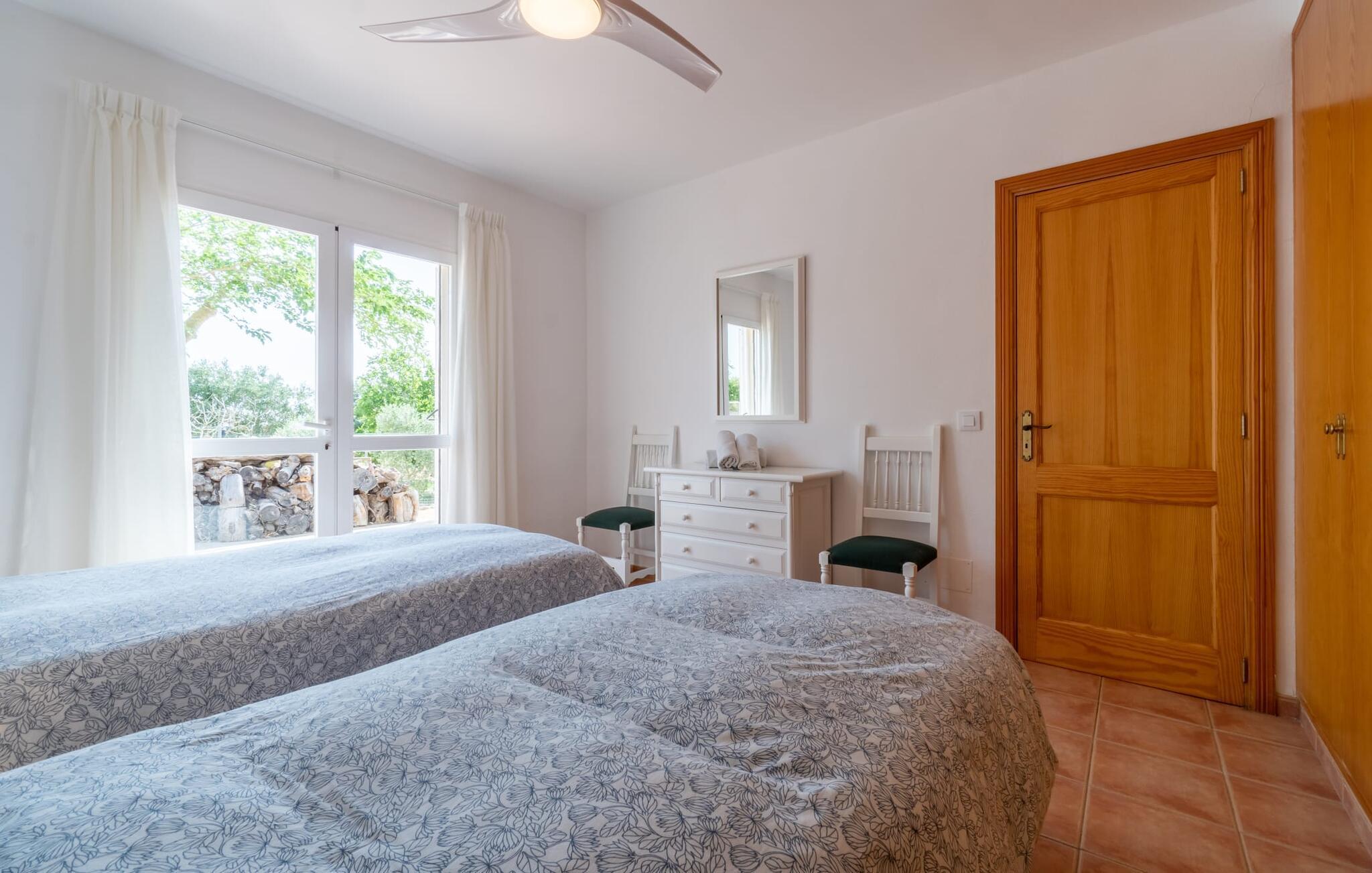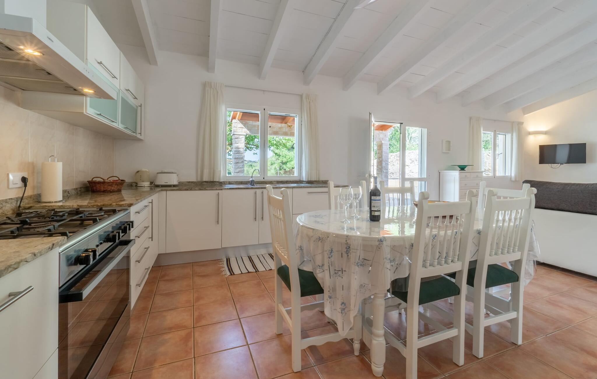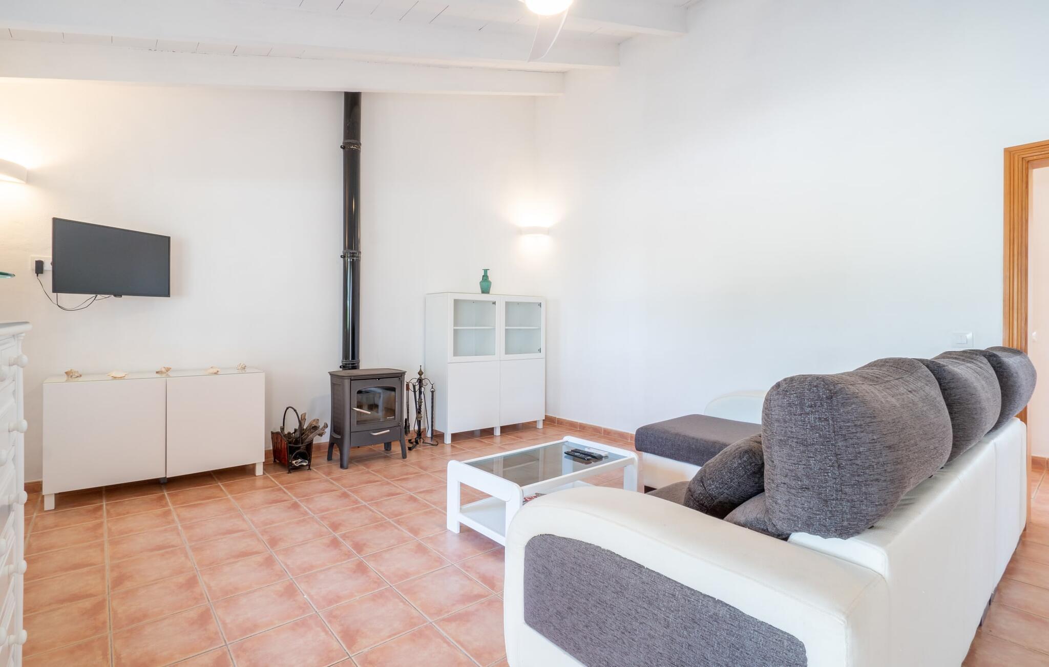 Obwohl nicht luxuriös, strahlt der klassische Einrichtungsstil eine sagenhafte Gemütlichkeit aus. Der kombinierte Wohn-, Ess- und Küchenbereich befindet sich in einem offenen Raum. Die Böden sind mit Terrakottafliesen ausgelegt, die Wände sind hell gestrichen und an der Decke sind Holzbalken zu sehen. Rund um den Kamin sind integrierte beleuchtete Regale angebracht. Die hübschen Accessoires kommen im sanften Licht besonders gut zur Geltung. Zwei bequeme Sofas laden zum Entspannen ein, sodass Sie in kühleren Nächten einen urigen Abend vor dem Kamin genießen können. An den Wänden hängt eine Sammlung handbemalter Porzellanteller – ein typisches Zeugnis mallorquinischen Kunsthandwerks. Zwischen dem Wohnbereich und der Küche befindet sich ein großer Essbereich mit einem ovalen Holztisch. Neben der Kommode gibt es in den Küchenzeilen viel Stauraum für das Geschirr. Für einen nostalgischen Touch sorgt der fünfflammige Gaskocher. Zwei Doppelzimmer bieten Platz für insgesamt vier Personen. Ein Schlafzimmer verfügt über ein Doppelbett im französischen Stil mit den Maßen 1,50 x 1,90 m, das zweite Schlafzimmer über zwei Einzelbetten mit den Maßen jeweils 0,9 x 2 m, sodass dieses Zimmer sehr gut für Kinder geeignet ist. Die Schränke in den Zimmern bieten ausreichend Platz für Ihre Urlaubsgarderobe. Das Tageslichtbad mit Badewanne und Dusche wird von beiden Schlafzimmern gemeinsam genutzt. Hervorzuheben ist der besonders günstige Preis, zu dem wir die komfortable Villa „Sa Caseta de Castellet“ auch in der Hochsaison anbieten können. In der Neben- und Nebensaison ist der Preis noch attraktiver.