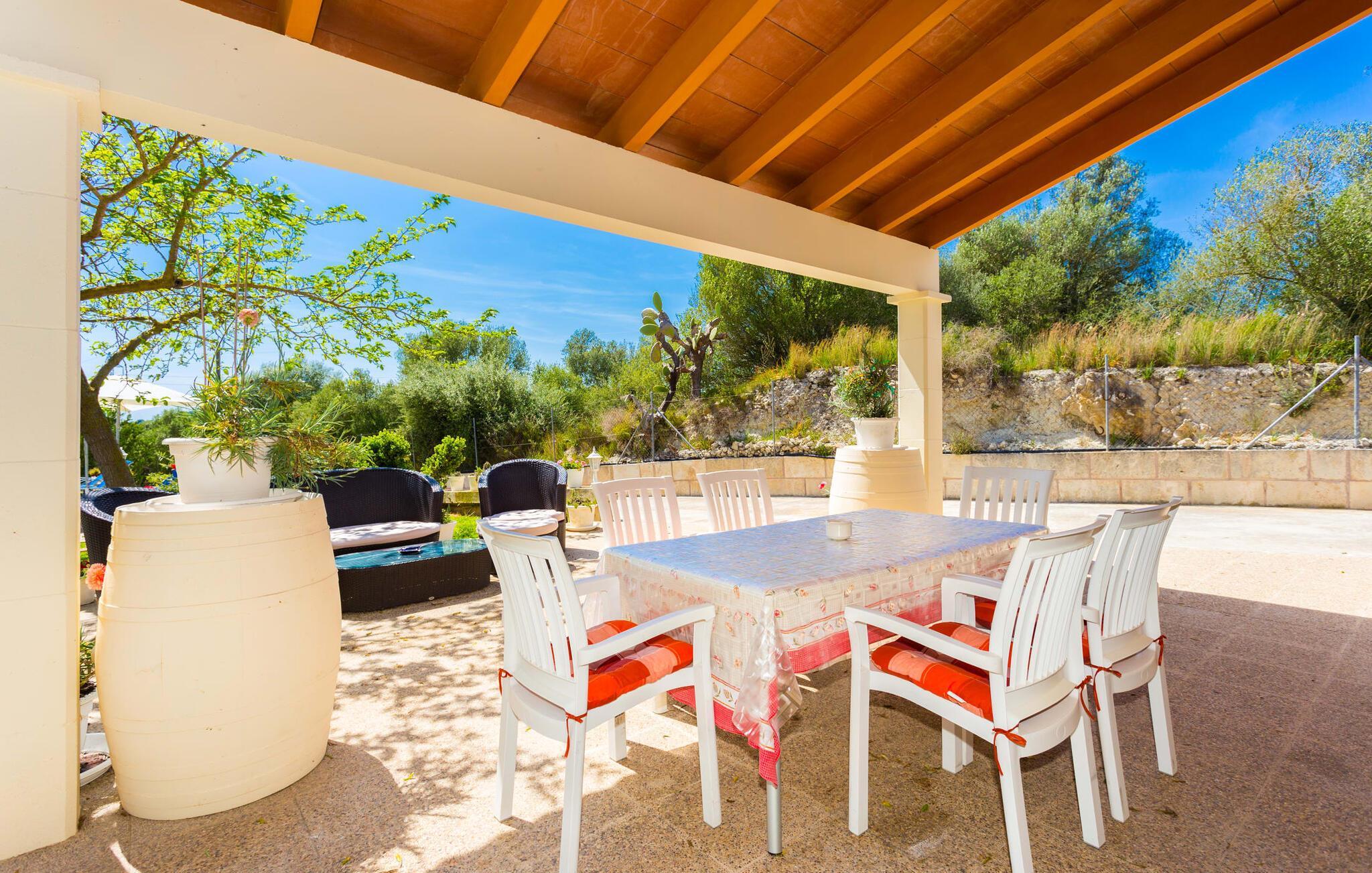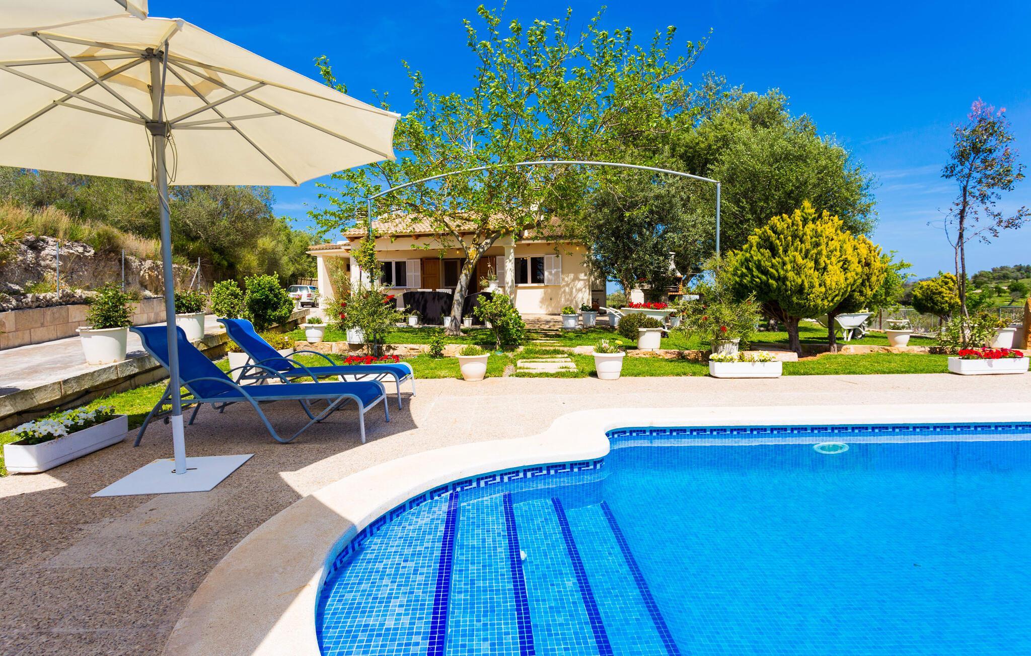 Heute wurden wir von Mateo eingeladen, gemeinsam seine Villa „Sa Caseta de Castellet“ zu besichtigen. Ein kleines, aber feines Ferienhaus, das alles Notwendige für einen Urlaub bietet, ohne auf Luxus zu verzichten. Bei der Ankunft in der Villa stellen wir fest, dass sie auf einem hübschen Anwesen liegt, umgeben von vielen Bäumen, völlig versteckt an einem fabelhaften, abgelegenen Ort. Mateo (der Besitzer) und sein Hund, der in der Finca lebt, heißen Sie herzlich willkommen. Auf Wunsch kann der Hund in seiner Zwingerhaltung gehalten werden, sodass er nicht frei herumläuft. Allein davon waren wir wirklich beeindruckt! Hier ist alles so natürlich und schon nach kurzer Zeit hat man nicht mehr das Gefühl, einfach nur im Urlaub zu sein. Der auffallend große Pool mit Außendusche liegt seitlich am Haus. Der Pool mit Mäandermuster ist kinderfreundlich und verfügt über einen ovalen Treppenzugang. Der Poolbereich ist von einer großen großzügigen Sonnenterrasse mit sechs Sonnenliegen umgeben. Sollte Schatten benötigt werden, stehen weiße Sonnenschirme zur Verfügung. Während Sie auf den Sonnenliegen am Pool entspannen, genießen Sie einen herrlichen Fernblick über die schöne Gegend um Santa Margalida. Besuchen wir die große Terrasse am Haus, gesäumt von vielen Pflanzen, von denen einige geschickt in ausgedienten Gartenaccessoires wie einer Schubkarre gepflanzt sind. Hier gibt es einen sehr schönen Essbereich mit weißen Möbeln unter einer überdachten Terrasse. Für gemütliches Beisammensein gibt es Polyrattan-Möbel mit bequemen weißen Kissen, teilweise im Stil einer Recamiere. In dieser Villa mit Blick auf den eingebauten Grill und den Brunnen können Sie abends die Natur und das Leben in vollen Zügen genießen. Neben dem Grill gibt es auch einen Außenküchenbereich mit Backofen – so können Sie einen Großteil Ihres Urlaubs draußen im milden Mittelmeer genießen.