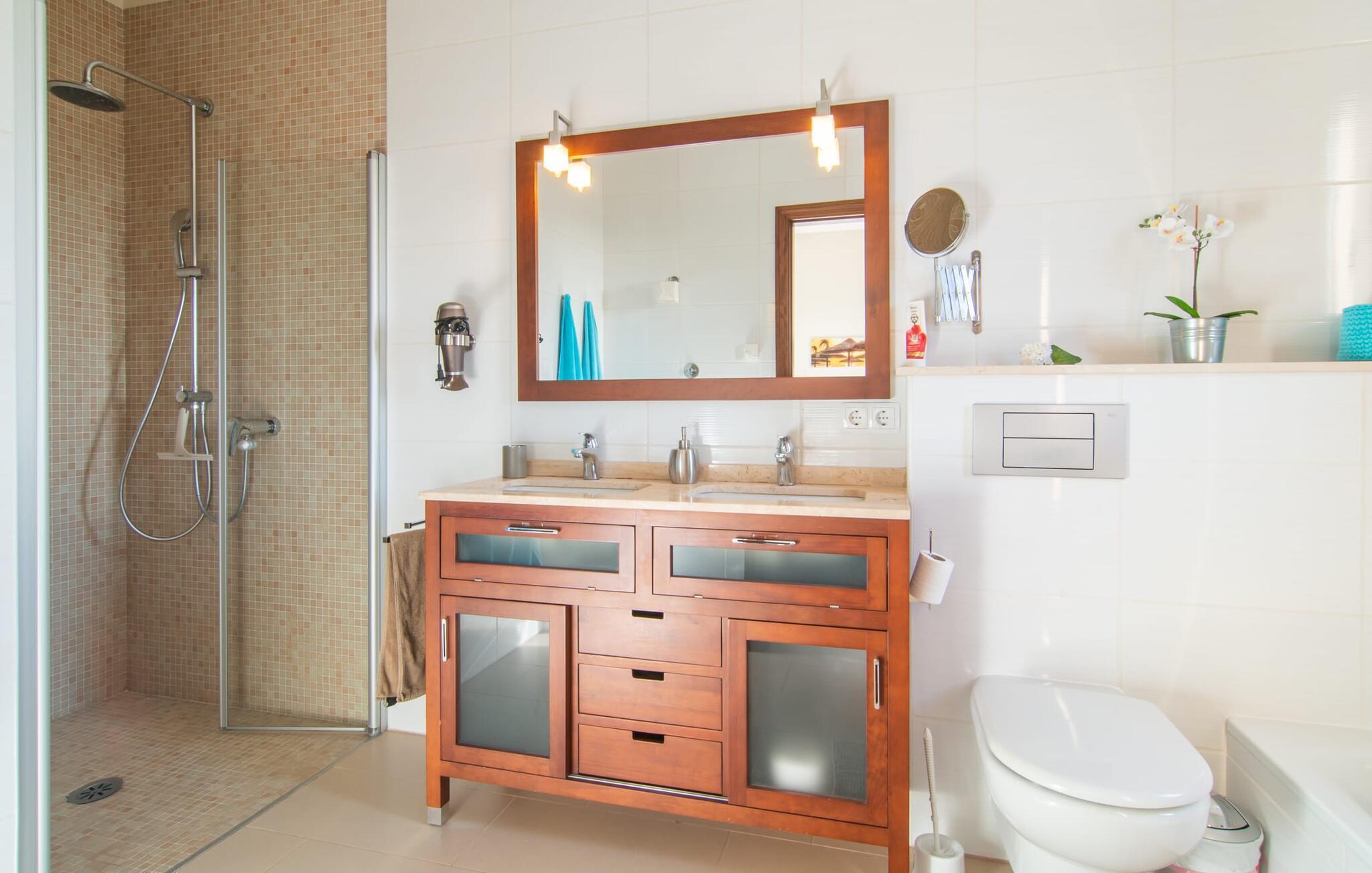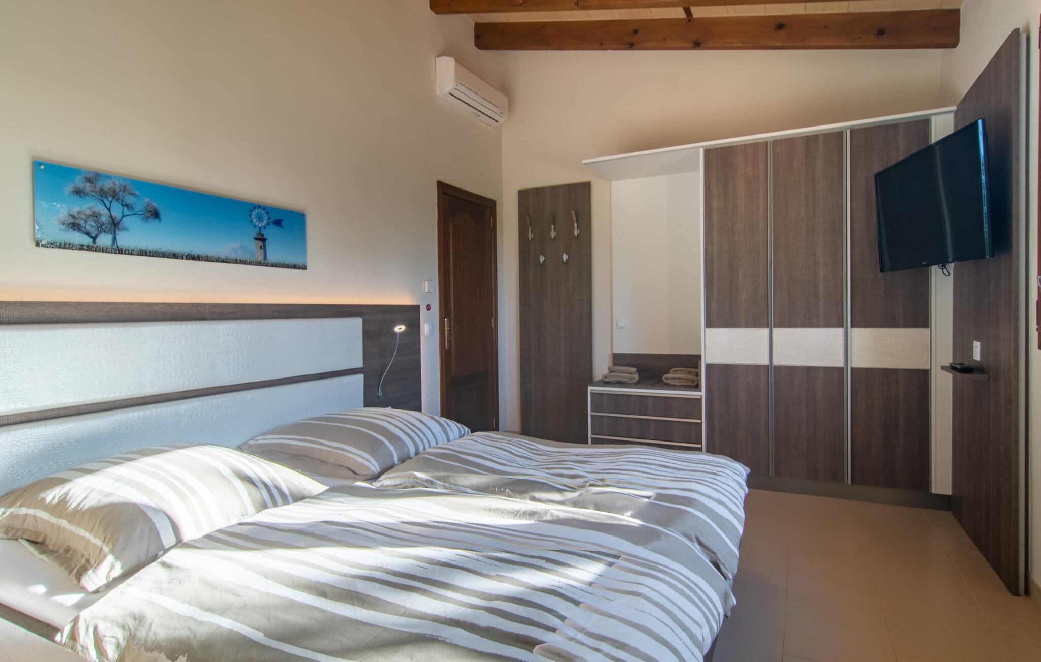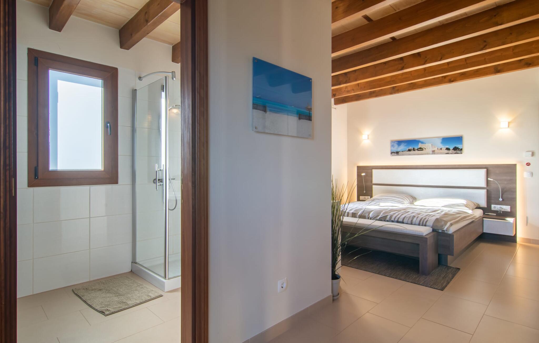 Ihr Ferienhaus auf Mallorca ist geschmackvoll und modern gestaltet. Helle Wände, inseltypische Fliesenböden und schöne Holzbalken an der Decke bilden den rustikalen Finca-Rahmen für eine zeitgemäße, gemütliche Inneneinrichtung. Viele große Fenster lassen überall Licht herein, liebevoll ausgewählte Wohnaccessoires sorgen für eine gemütliche Wohlfühlatmosphäre. Im Erdgeschoss befindet sich ein langer, offener Raum, der den Wohn- und Essbereich sowie die gut ausgestattete Küche beherbergt. Dort kann man an einer Theke mit Barhockern ein kleines Frühstück einnehmen oder dem Koch beim Zuschneiden und Anrichten helfen. Wenn Sie müde sind, können Sie auf dieser Ebene in eines der beiden Doppelzimmer mit jeweils eigenem Bad gehen. Ein weiteres Doppelschlafzimmer, ebenfalls mit Bad en Suite, aber auch einer eigenen kleinen Kaffeeecke und Dachterrasse, befindet sich im Obergeschoss.