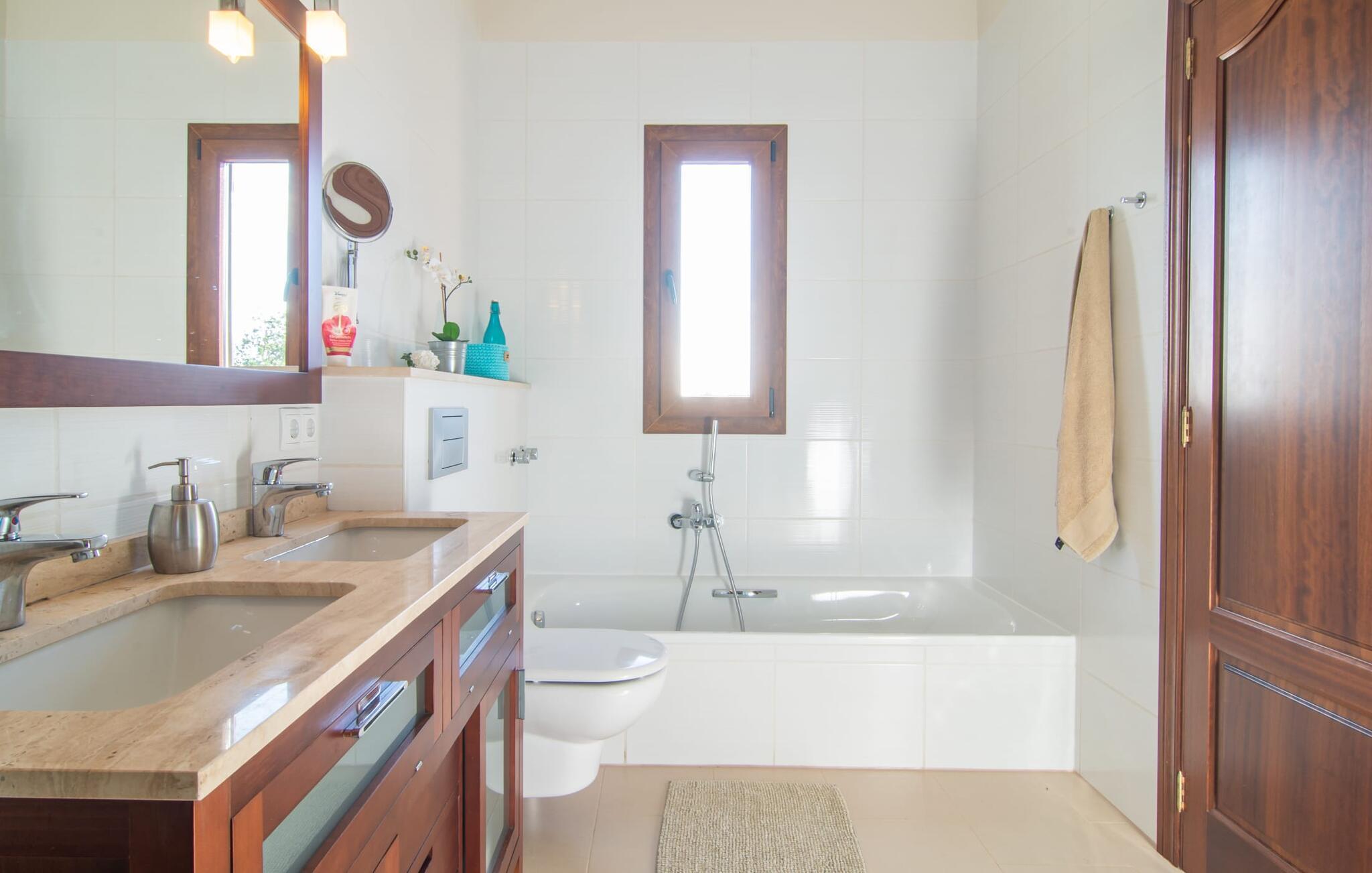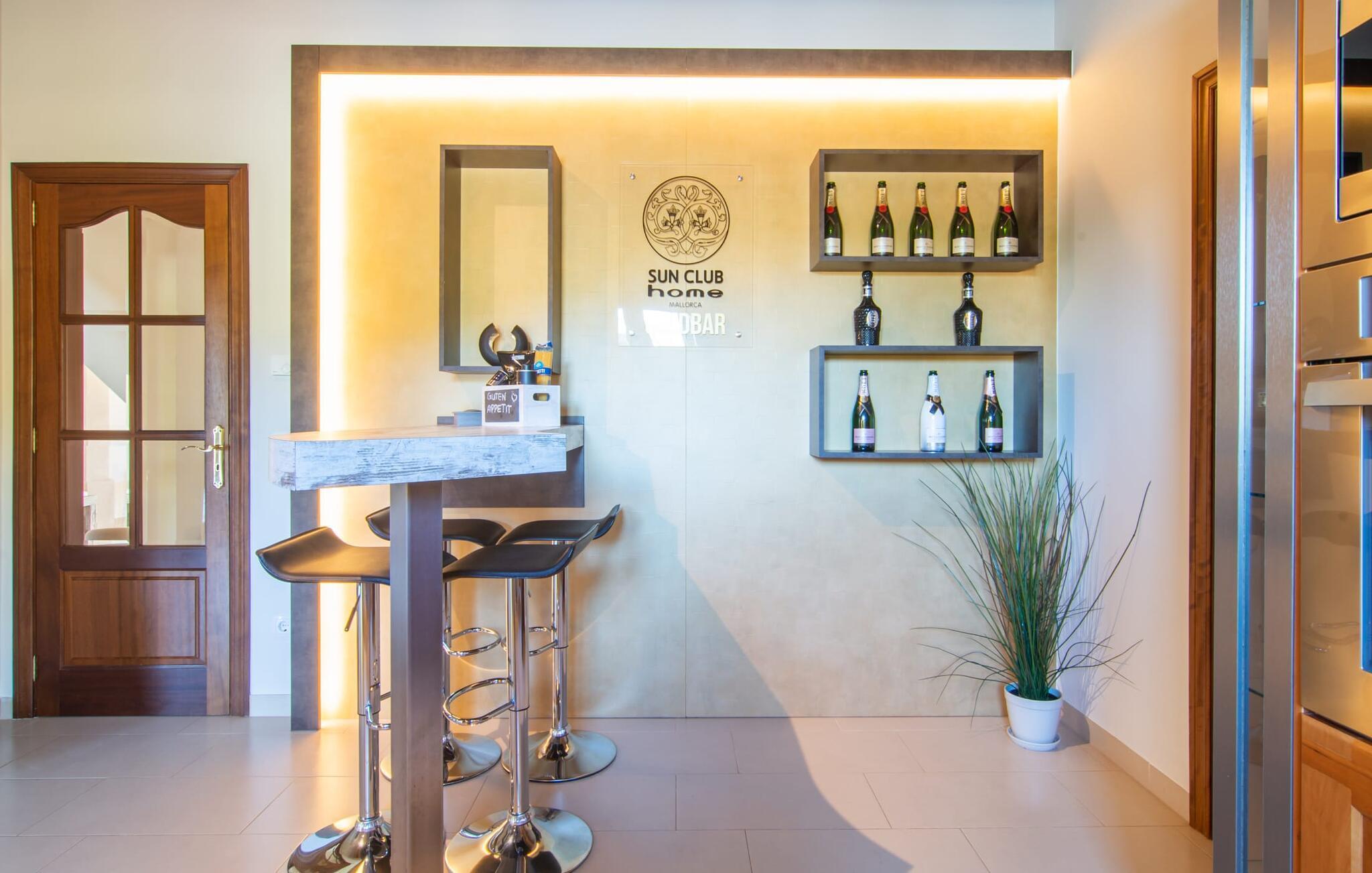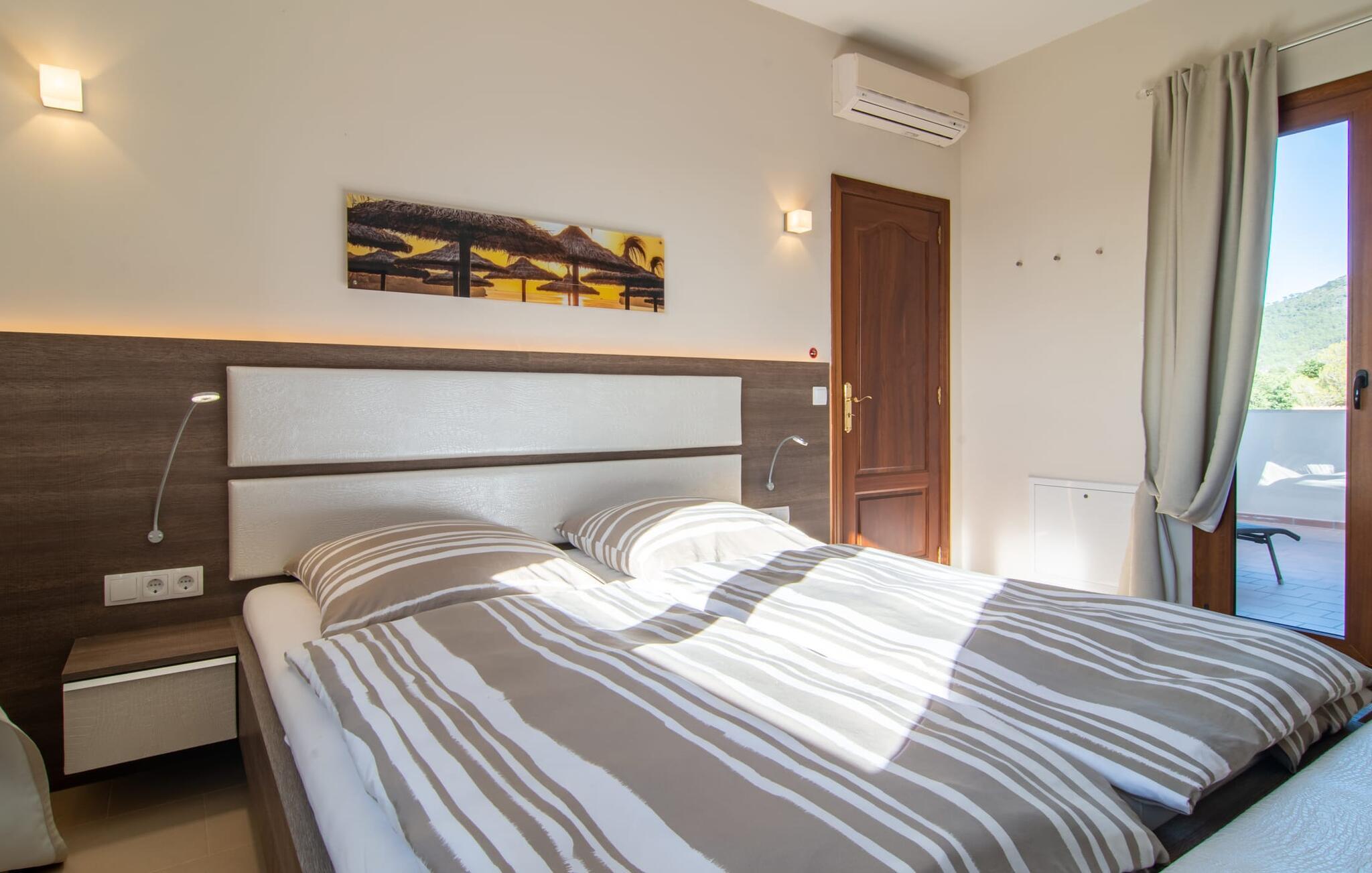 Ihr Ferienhaus auf Mallorca ist geschmackvoll und modern gestaltet. Helle Wände, inseltypische Fliesenböden und schöne Holzbalken an der Decke bilden den rustikalen Finca-Rahmen für eine zeitgemäße, gemütliche Inneneinrichtung. Viele große Fenster lassen überall Licht herein, liebevoll ausgewählte Wohnaccessoires sorgen für eine gemütliche Wohlfühlatmosphäre. Im Erdgeschoss befindet sich ein langer, offener Raum, der den Wohn- und Essbereich sowie die gut ausgestattete Küche beherbergt. Dort kann man an einer Theke mit Barhockern ein kleines Frühstück einnehmen oder dem Koch beim Zuschneiden und Anrichten helfen. Wenn Sie müde sind, können Sie auf dieser Ebene in eines der beiden Doppelzimmer mit jeweils eigenem Bad gehen. Ein weiteres Doppelschlafzimmer, ebenfalls mit Bad en Suite, aber auch einer eigenen kleinen Kaffeeecke und Dachterrasse, befindet sich im Obergeschoss.