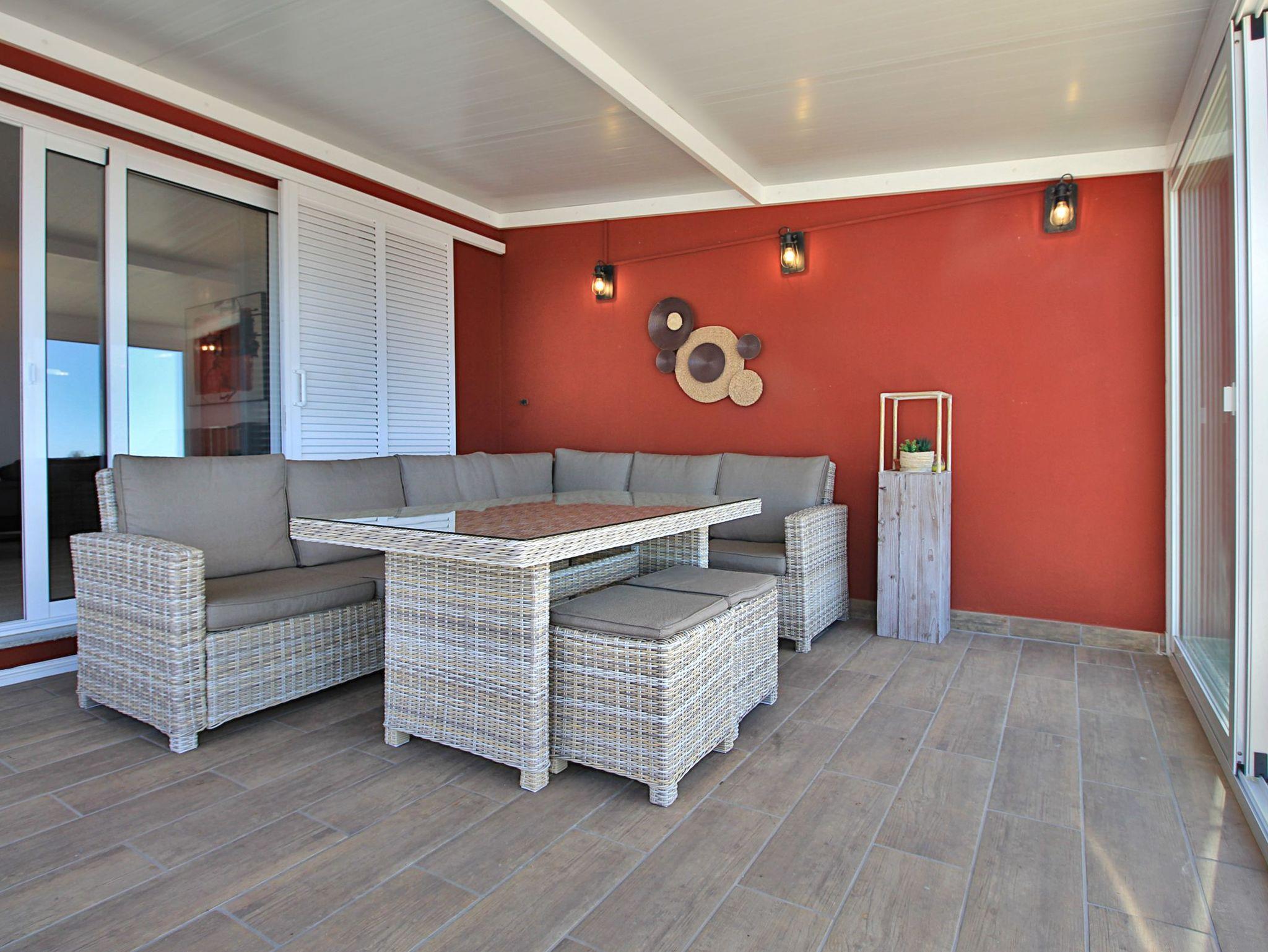 Das moderne Wohnzimmer mit neuem Sofa mit Chaiselongue und Glastisch hat direkten Zugang zur Terrasse und zum Lounge Bereich.
