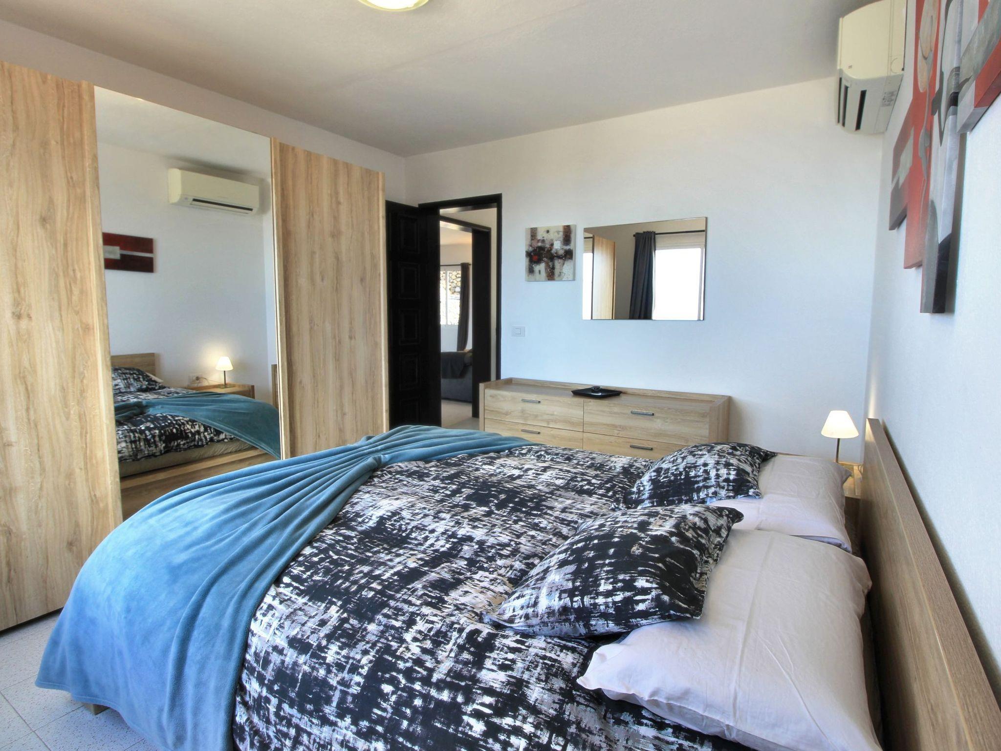 Das Hauptschlafzimmer ist nach Westen orientiert und hat Meerblick, es kann vollständig abgedunkelt werden. Ein großer Wandschrank bietet Platz für Ihre Urlaubsgarderobe.