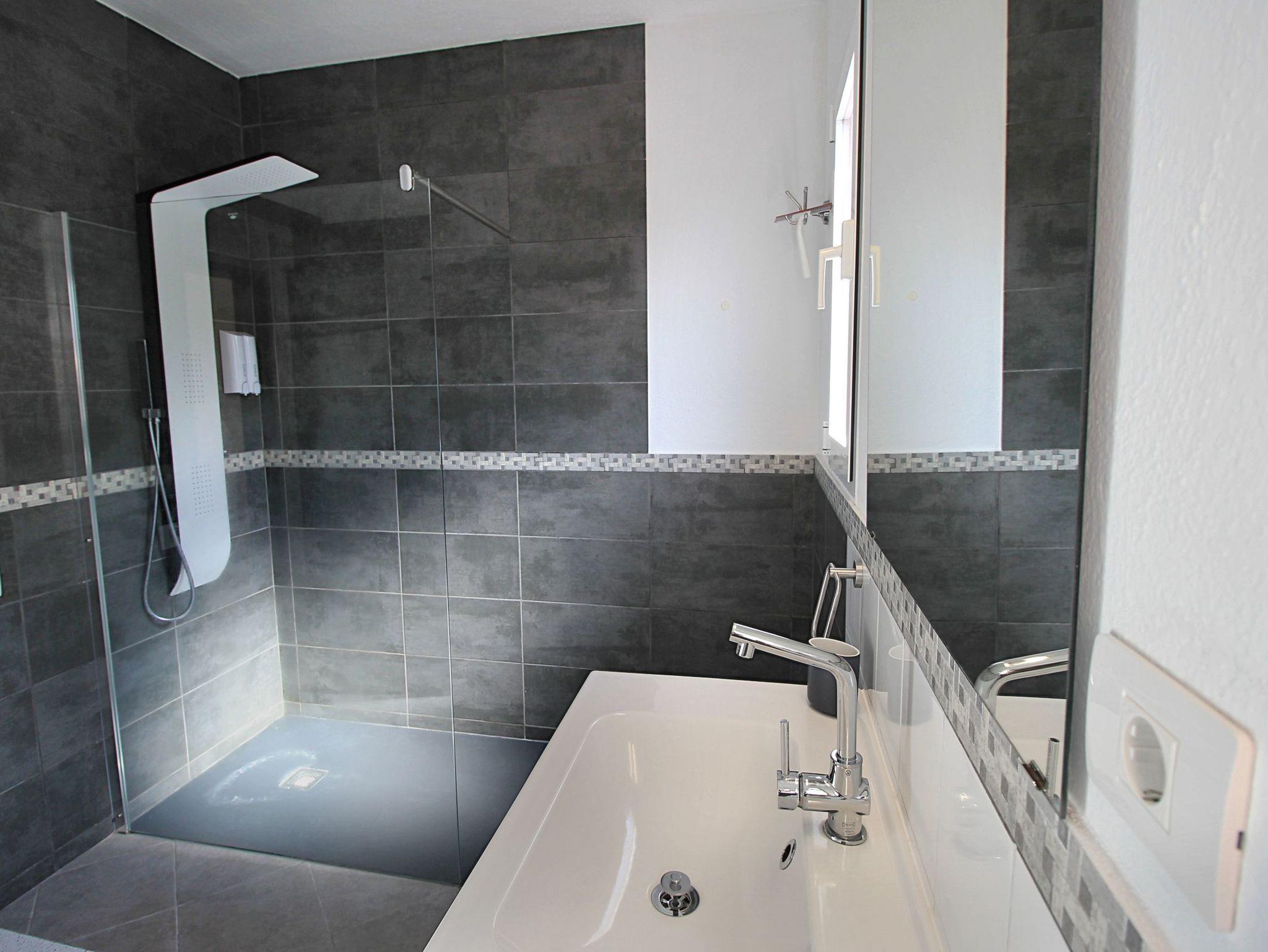 Das helle Badezimmer wurde modern gestaltet und bietet eine bodengleiche Dusche sowie viel Ablagefläche.
