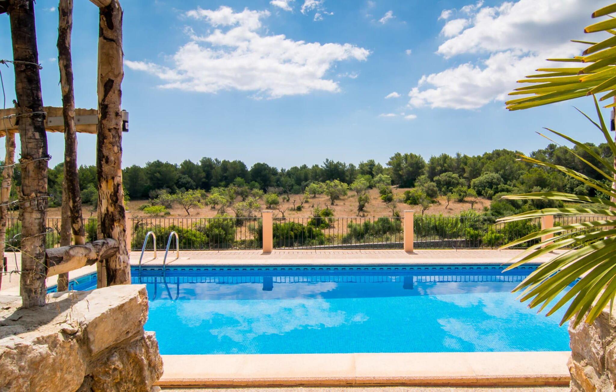 Die erhöhte Lage verfügt über einen Balkon mit Blick auf den Pool und die umliegenden Berge. Der Pool ist mit blauen Mosaikfliesen geschmückt und von bequemen Liegen und Sonnenschirmen umgeben. Der angelegte Garten umfasst Palmen und einen gepflegten Rasen, der sich ideal zum Entspannen oder Spielen mit den Kindern eignet.