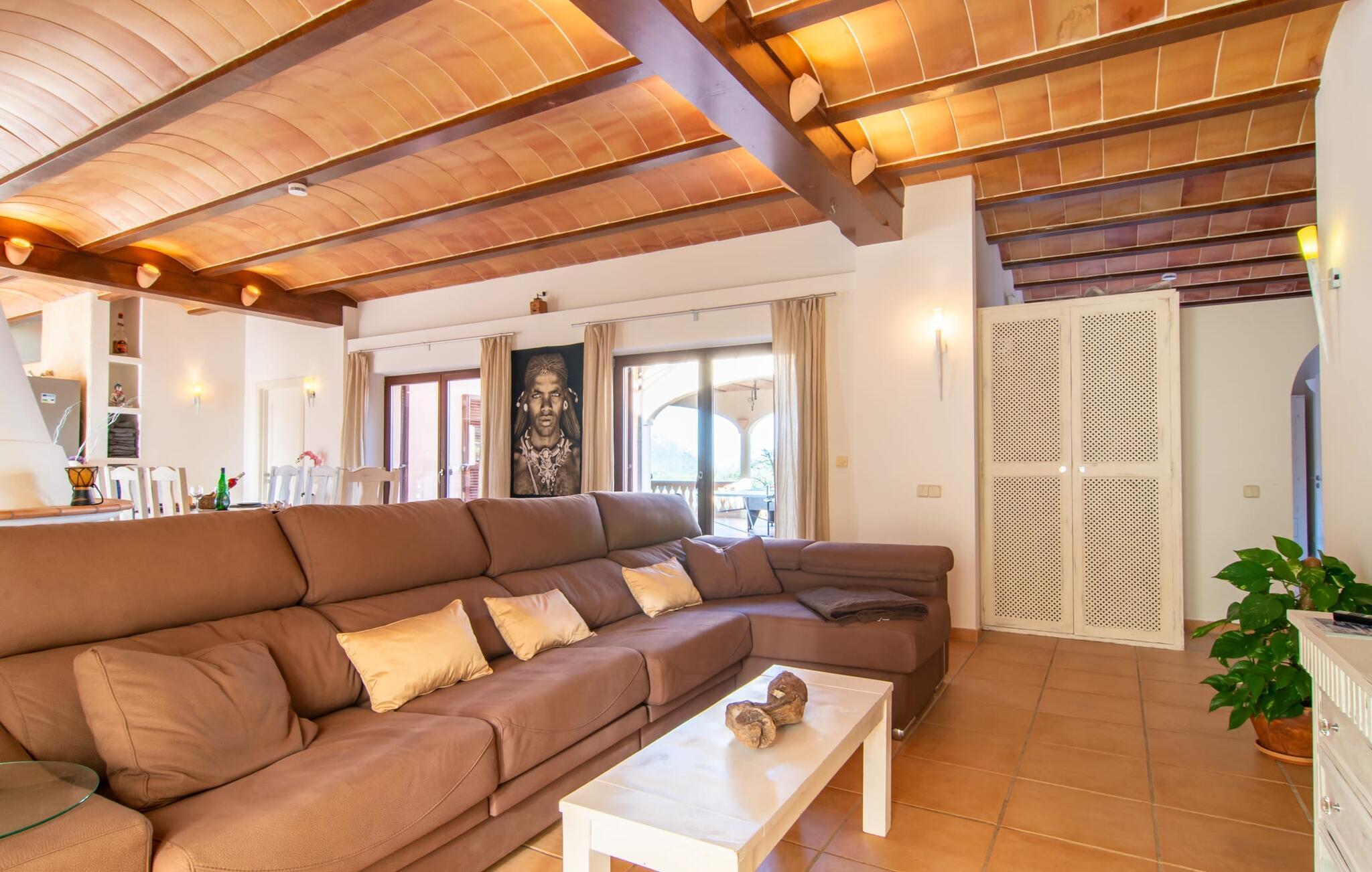 Wunderschön hell, frisch und freundlich empfängt Sie dieses Ferienhaus auf Mallorca auch von innen: Die moderne Einrichtung erhält durch ausgewählte Wohnaccessoires eine individuelle Note und verbreitet ein sommerlich leichtes Wohlfühlflair. Wohn- und Esszimmer gehen großzügig ineinander über und laden mit verschiedenen bequemen Sitzgelegenheiten zum Verweilen ein – sei es zum gemeinsamen Essen am großen Esstisch, zum Plausch mit Mitreisenden am heimischen Kamin oder zum Fernsehabend auf dem Sofa. Leckere Snacks und Getränke können bequem direkt aus der offenen Küche, die mit hochwertigen Geräten ausgestattet ist, eingenommen werden. Durch eine Glastür gelangt man auch auf die Terrasse und den Poolbereich. Alle Schlafzimmer, ergänzt durch moderne Badezimmer en Suite, sind geschmackvoll und dezent gestaltet und passen zum Rest der Inneneinrichtung dieses schicken Ferienhauses auf Mallorca – einige davon verfügen sogar über rustikale Natursteinelemente und wunderschön gewellte Decken, die eine echte Finca-Atmosphäre schaffen . Hier können Sie Ihren Urlaub so richtig genießen: Die großzügige „Wellnessfinca Las Palmeras“ liegt ruhig auf einem großzügigen, gepflegten Grundstück unweit des beliebten Ferienortes Cala Ratjada im Osten Mallorcas. Haus und Grundstück sind fantastisch ausgestattet, inklusive großem Pool mit Sonnenterrasse. Einkaufsmöglichkeiten, Restaurants und Cafés finden Sie im nur 3 km entfernten Cala Agulla. Die wunderschöne gleichnamige Badebucht mit angrenzendem Naturschutzgebiet erreichen Sie nach nur 2,8 km.