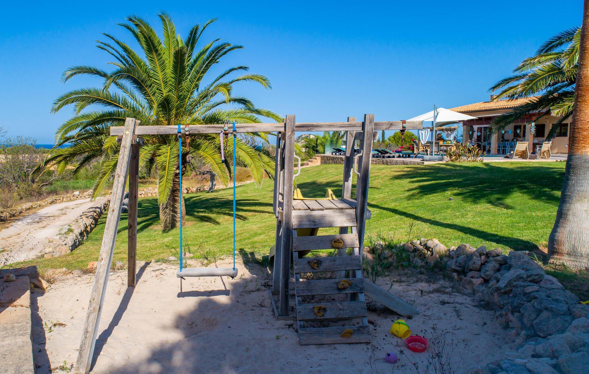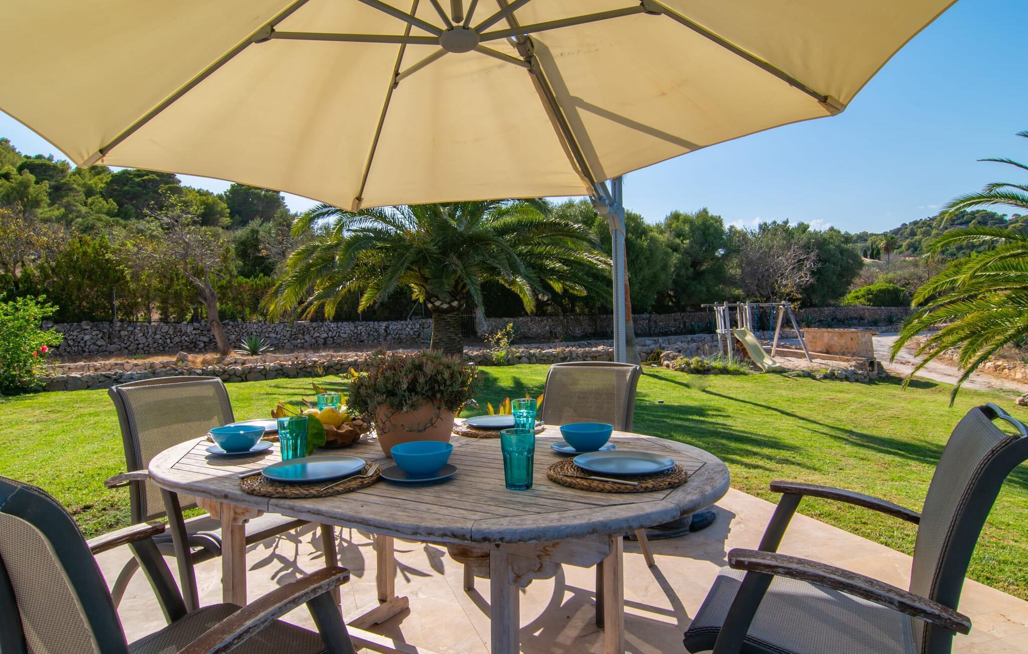 Ein großzügiges Anwesen mit herrlichem Blick auf das nahe Meer und die grünen Berge in der Umgebung: Das Ferienhaus „Wellnessfinca Las Palmeras“ macht seinem Namen allein schon durch seine äußerst ruhige Lage inmitten einer traumhaften mediterranen Landschaft alle Ehre – das natürliche, supergepflegte Atmosphäre ist geradezu Wellness für die Seele. Die schicke Finca im Osten Mallorcas bietet nicht nur jede Menge Entspannung für Ruhe- und Erholungssuchende, sondern hält auch für aktive Familien einiges bereit: Neben dem großen Pool inklusive einer großzügigen Sonnenterrasse mit hochwertigen Outdoor-Möbeln Und ein überdachter Essbereich, eine Tischtennisplatte, ein Volleyballnetz, eine Schaukel und eine Rutsche warten beispielsweise auf lebhafte Kinder und Jugendliche, die mit ihren Eltern ihren Urlaub auf der Insel verbringen. Der Pool verfügt über eine Besonderheit, die Eltern ansprechen wird. Es verfügt über eine elektrische Poolalarmanlage: Sobald eine Wellenbewegung (fallendes Kind) auftritt, ertönt ein lautes Signal.