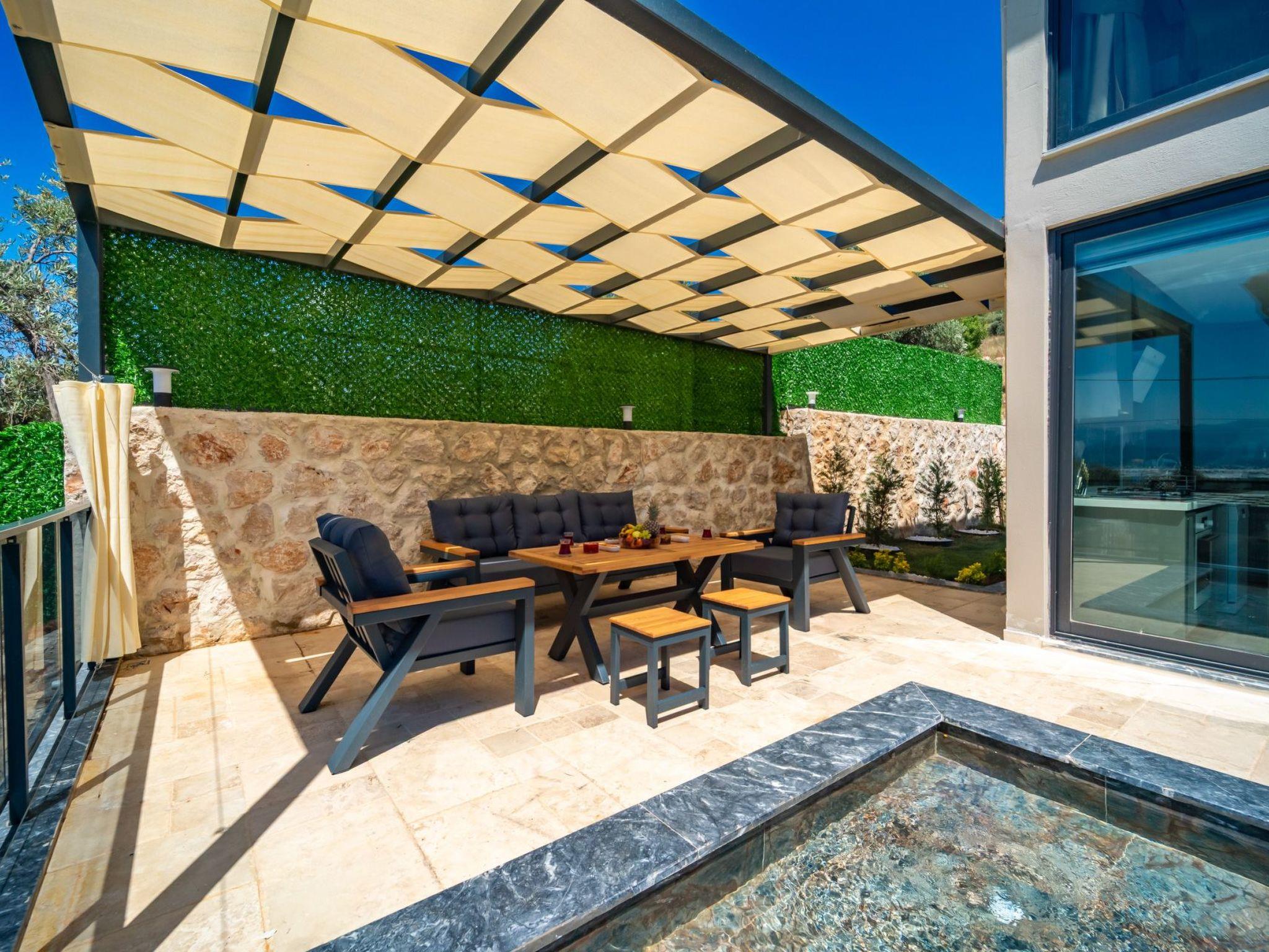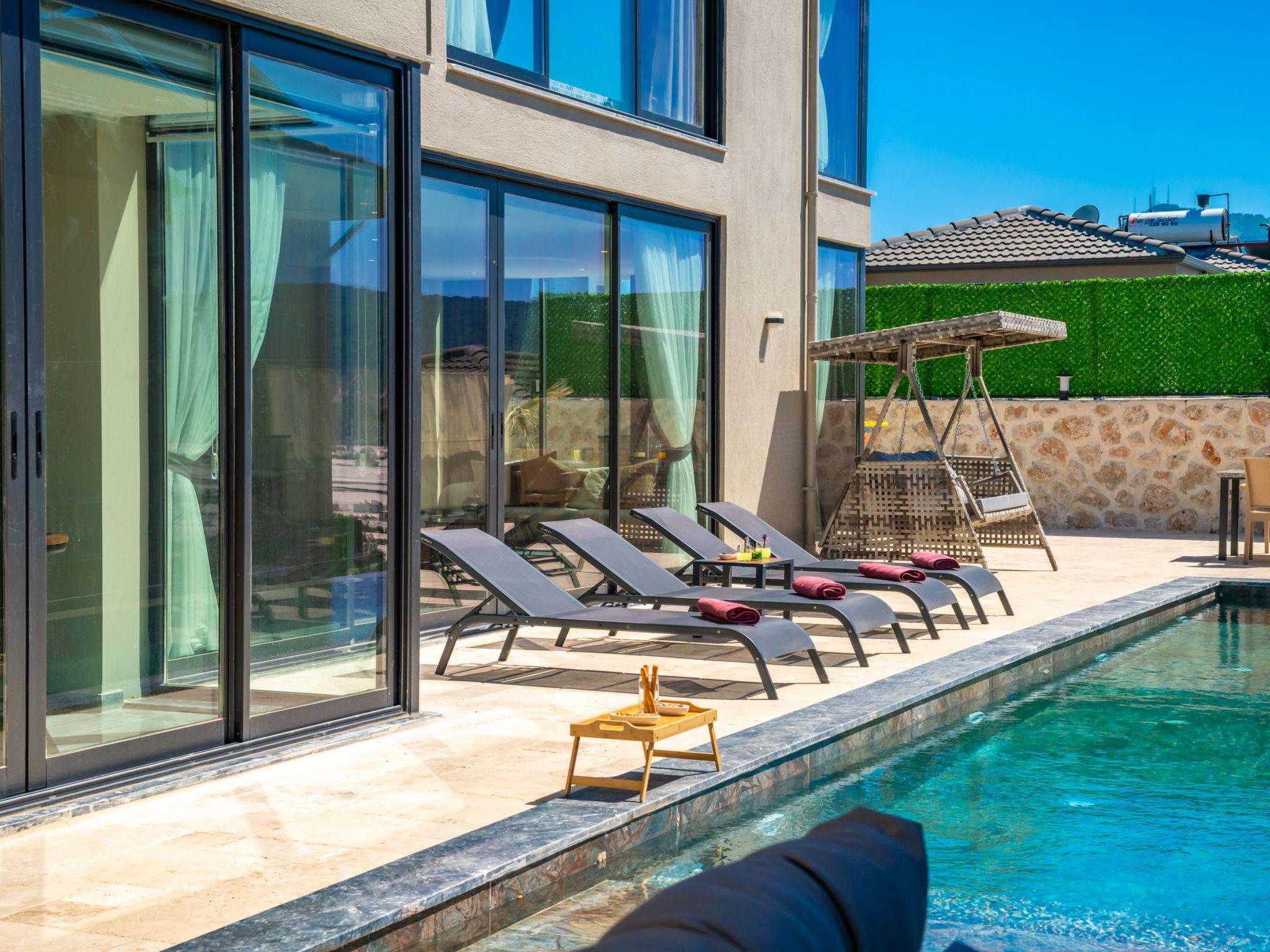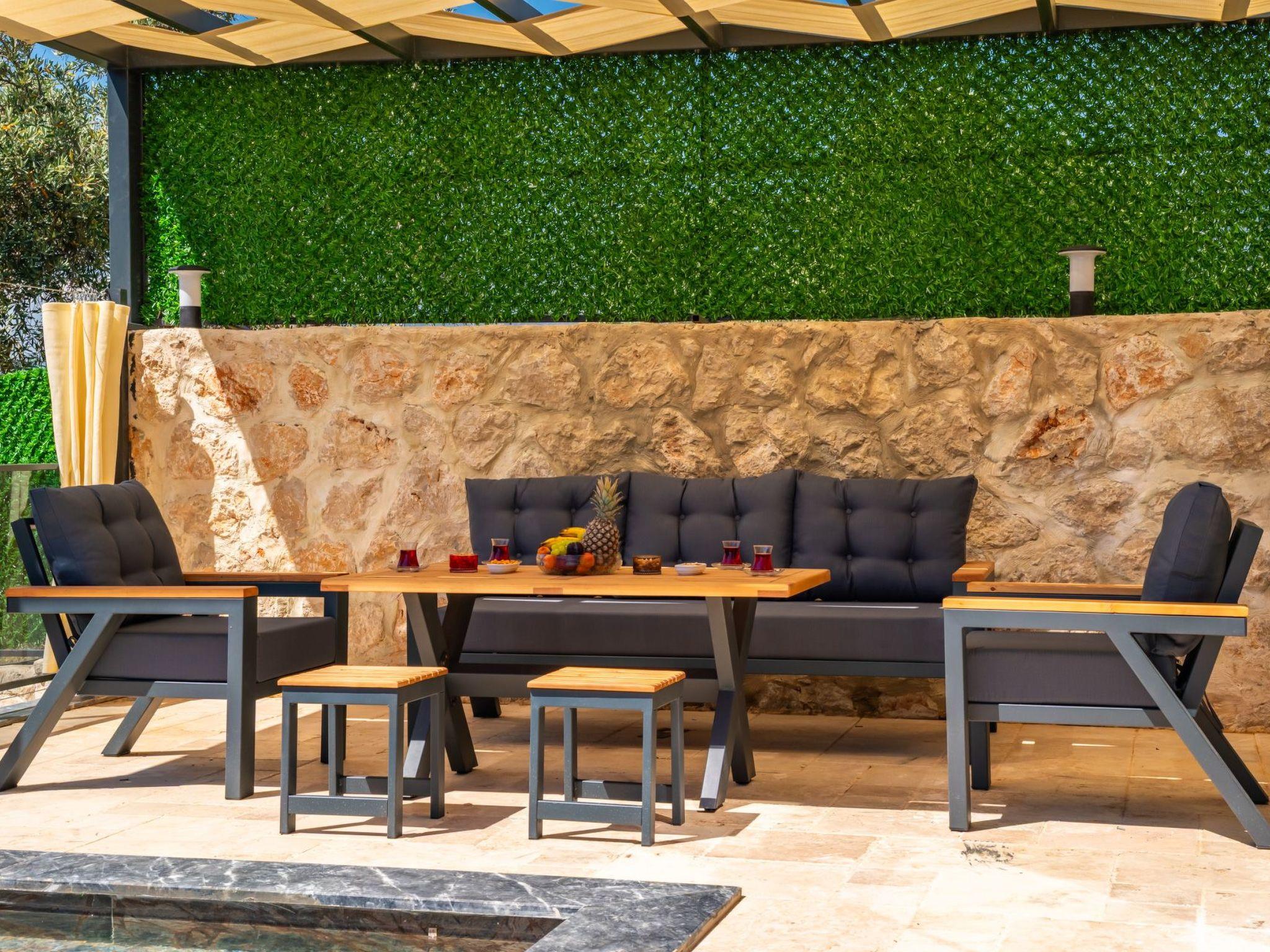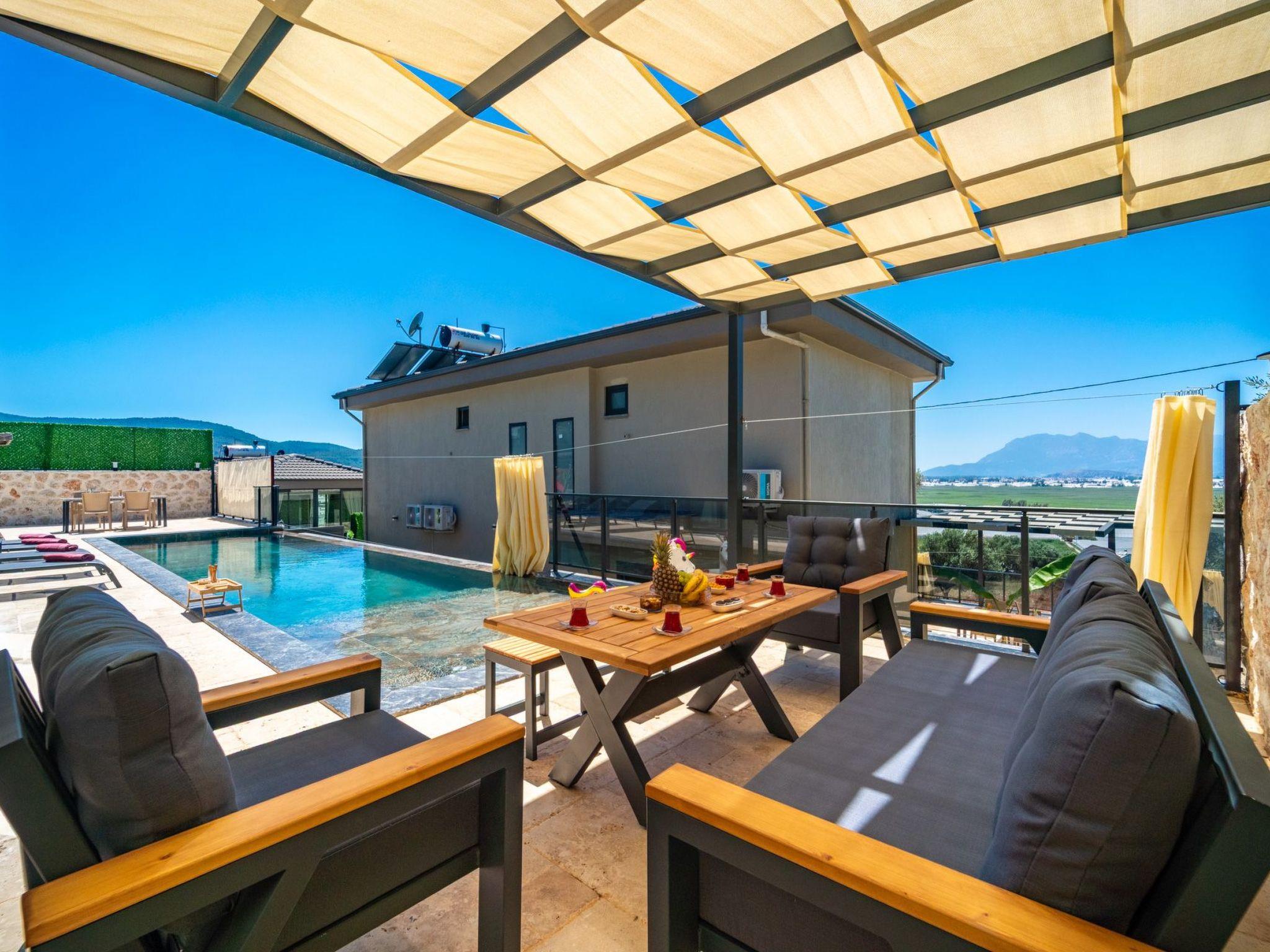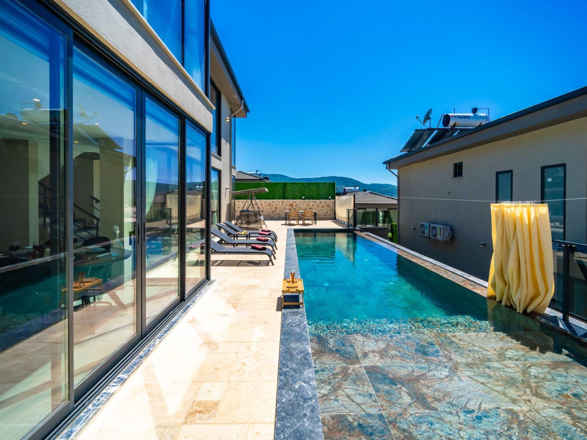 Außen lockt der private Pool zur alleinigen Nutzung, der an warmen Tagen für erfrischende Momente sorgt. Der Garten des Ferienhauses bietet ebenfalls eine private Oase, die zum Entspannen unter der anatolischen Sonne einlädt. Die Außenbereiche sind sorgfältig angelegt, um Ihnen Ruhe und Privatsphäre während Ihres Aufenthalts zu garantieren. Hier können Sie ungestört die Zeit mit Ihren Lieben verbringen.