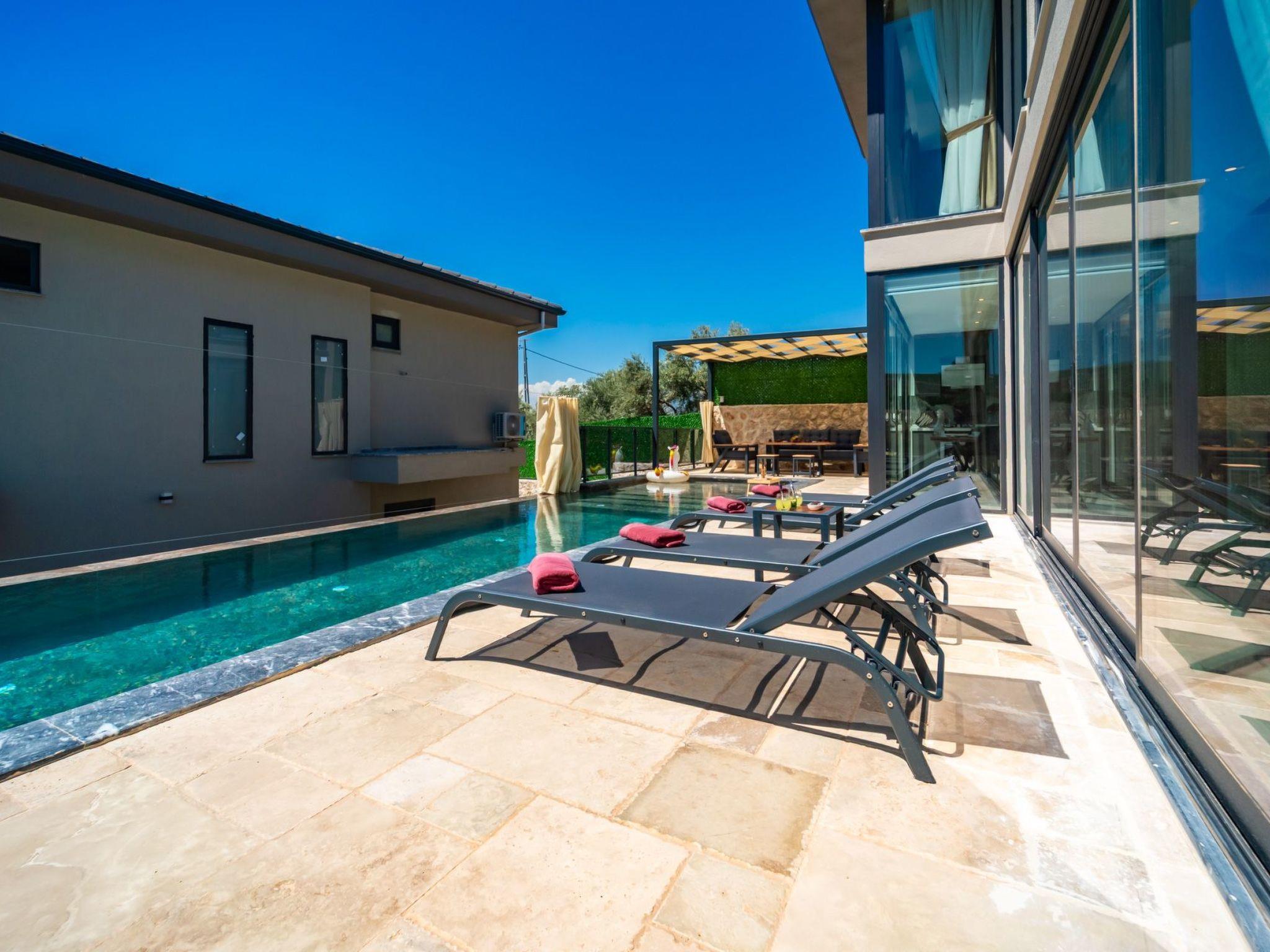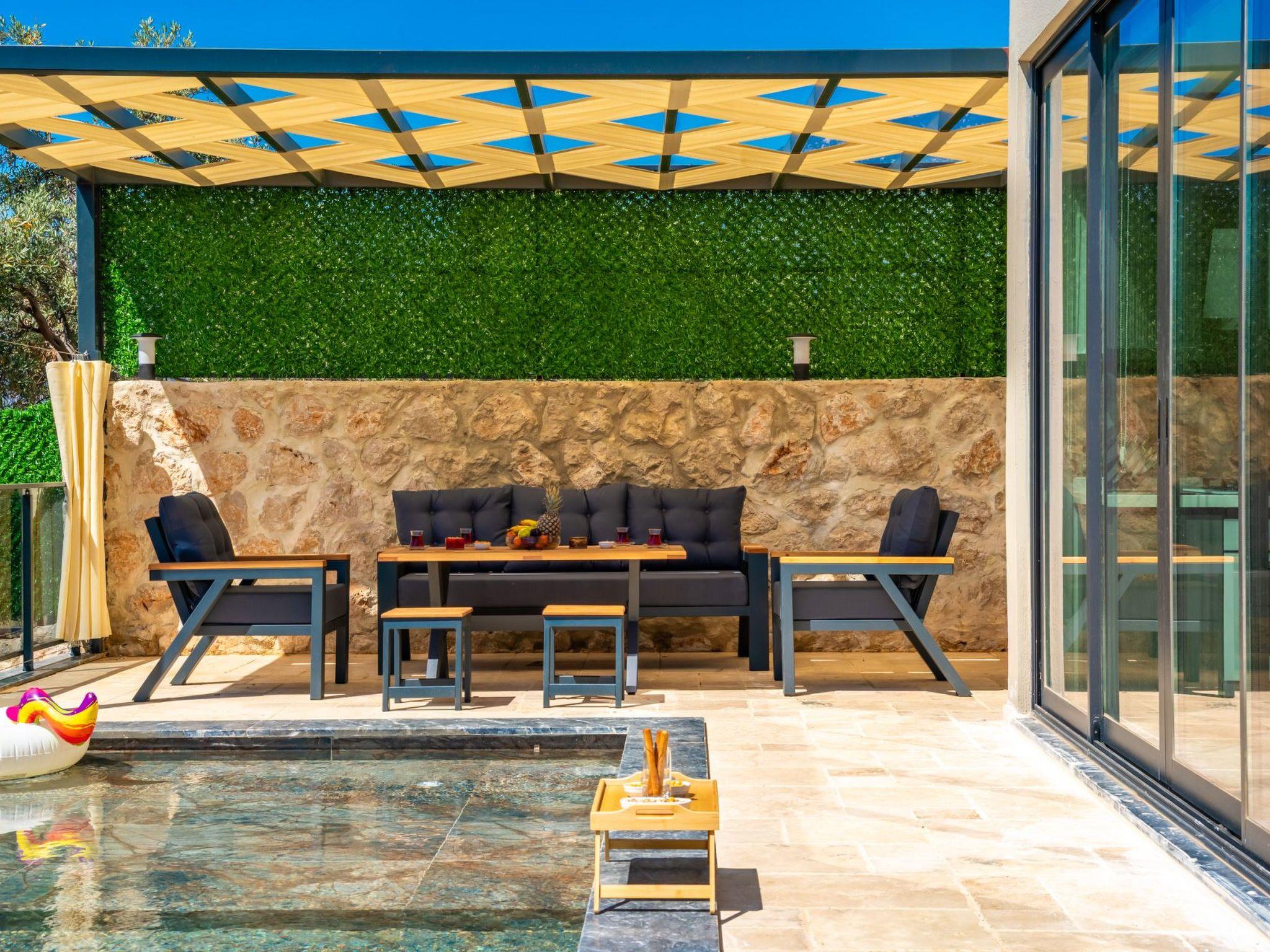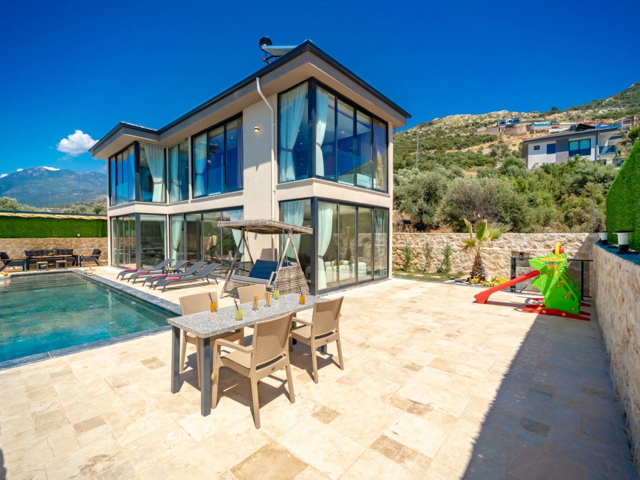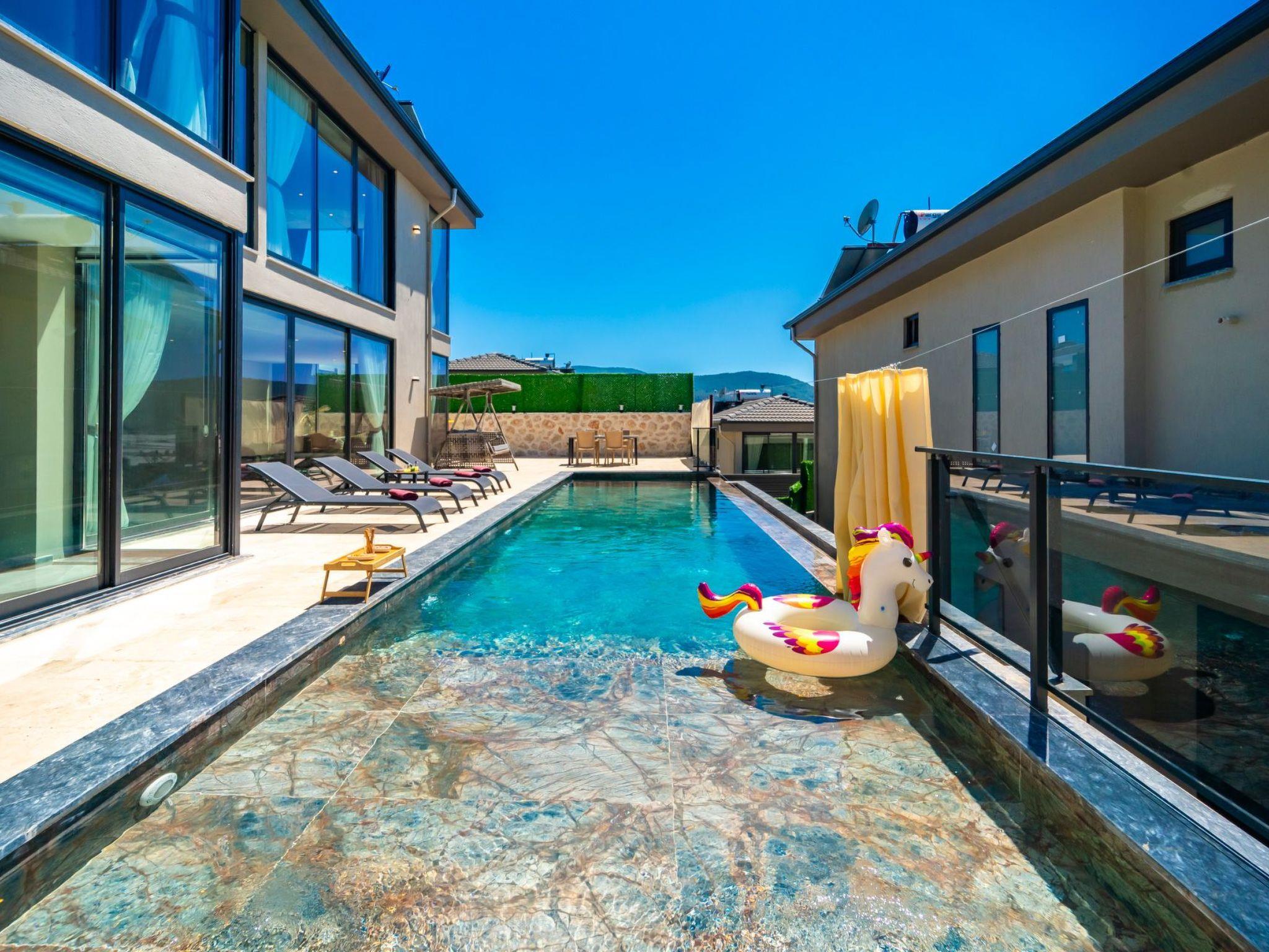 Außen lockt der private Pool zur alleinigen Nutzung, der an warmen Tagen für erfrischende Momente sorgt. Der Garten des Ferienhauses bietet ebenfalls eine private Oase, die zum Entspannen unter der anatolischen Sonne einlädt. Die Außenbereiche sind sorgfältig angelegt, um Ihnen Ruhe und Privatsphäre während Ihres Aufenthalts zu garantieren. Hier können Sie ungestört die Zeit mit Ihren Lieben verbringen.