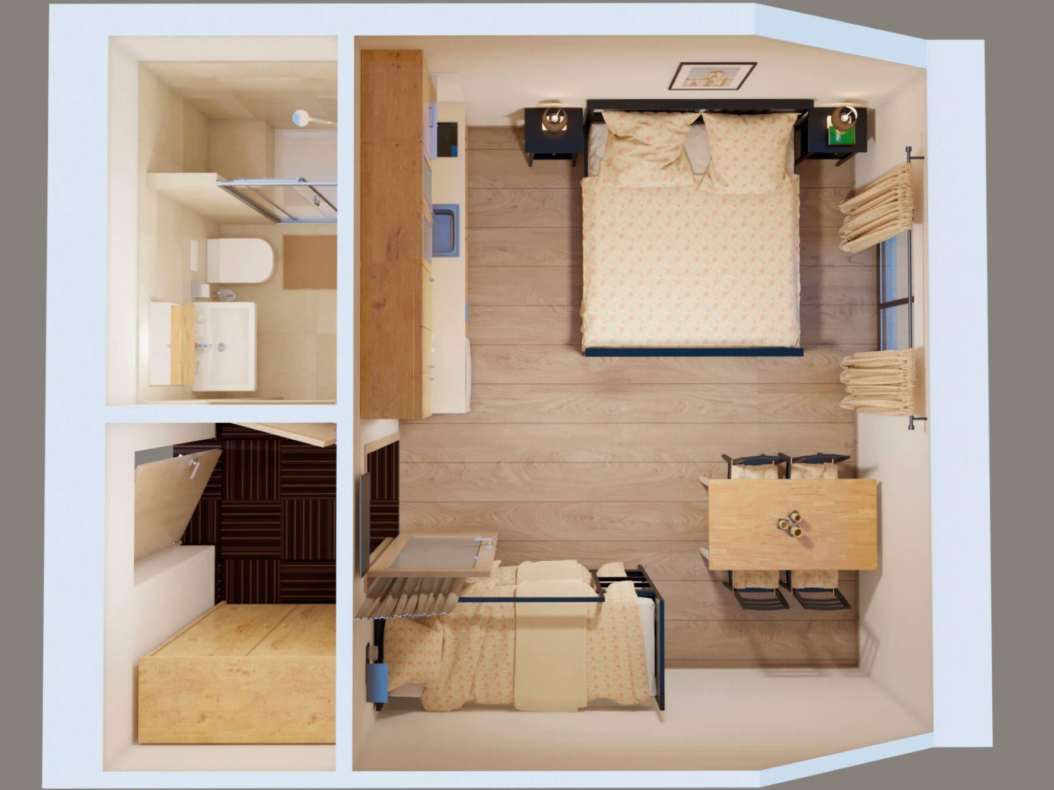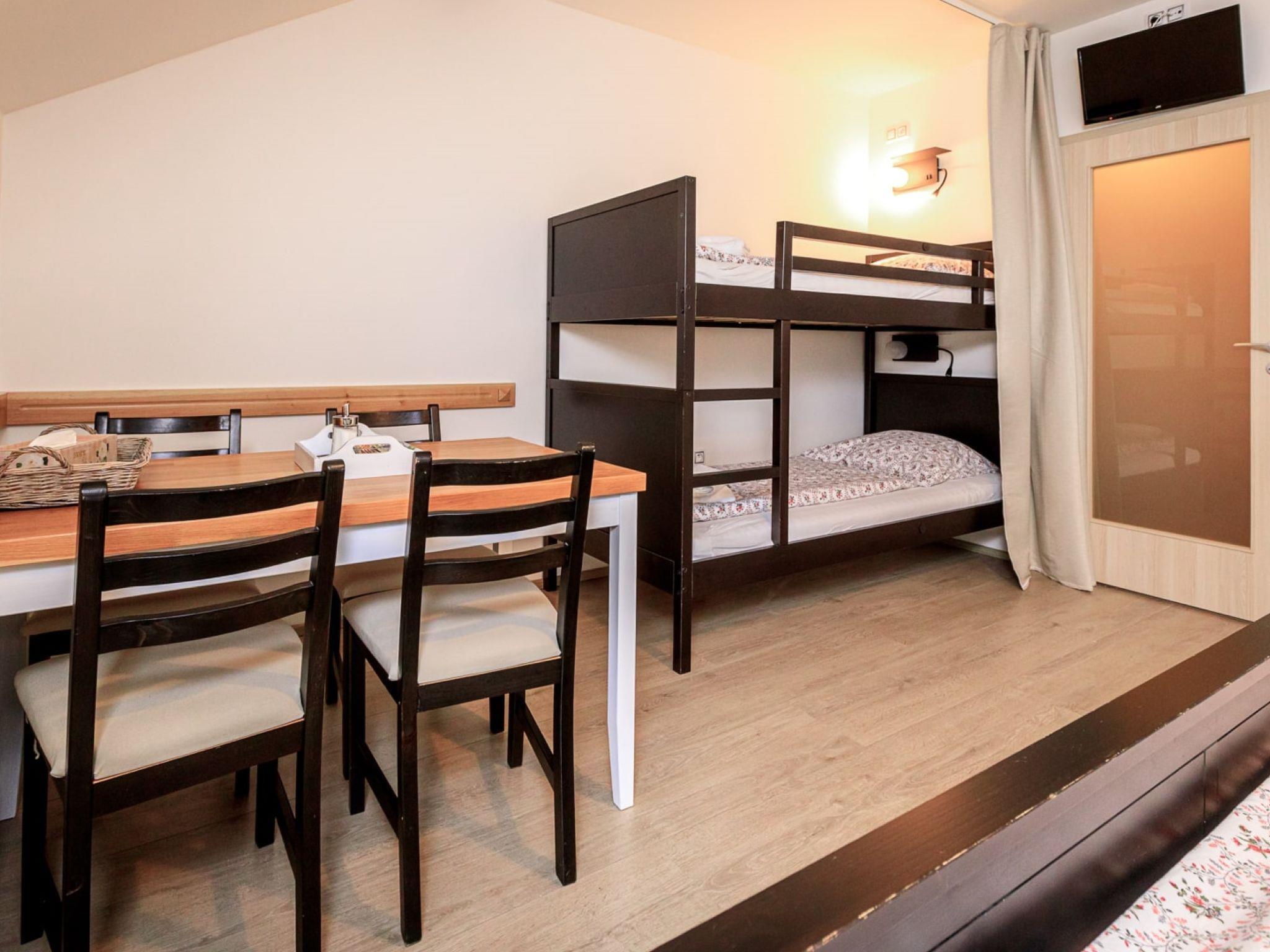 "Arnoltice 8", 1-Zimmer-Wohnung im 1. Stock. Eingang. Wohn-/Schlafzimmer mit 1 x 2 Etagenbetten, 1 Doppelbett und Sat-TV. Kochnische (2 Glaskeramikplatten, Toaster, Wasserkocher, Mikrowelle) mit Esstisch. Dusche/WC. Sicht auf den Garten. Zur Verfügung: Internet (Wireless LAN, gratis). Bitte beachten: geeignet für Familien. Nichtraucher-Unterkunft.
