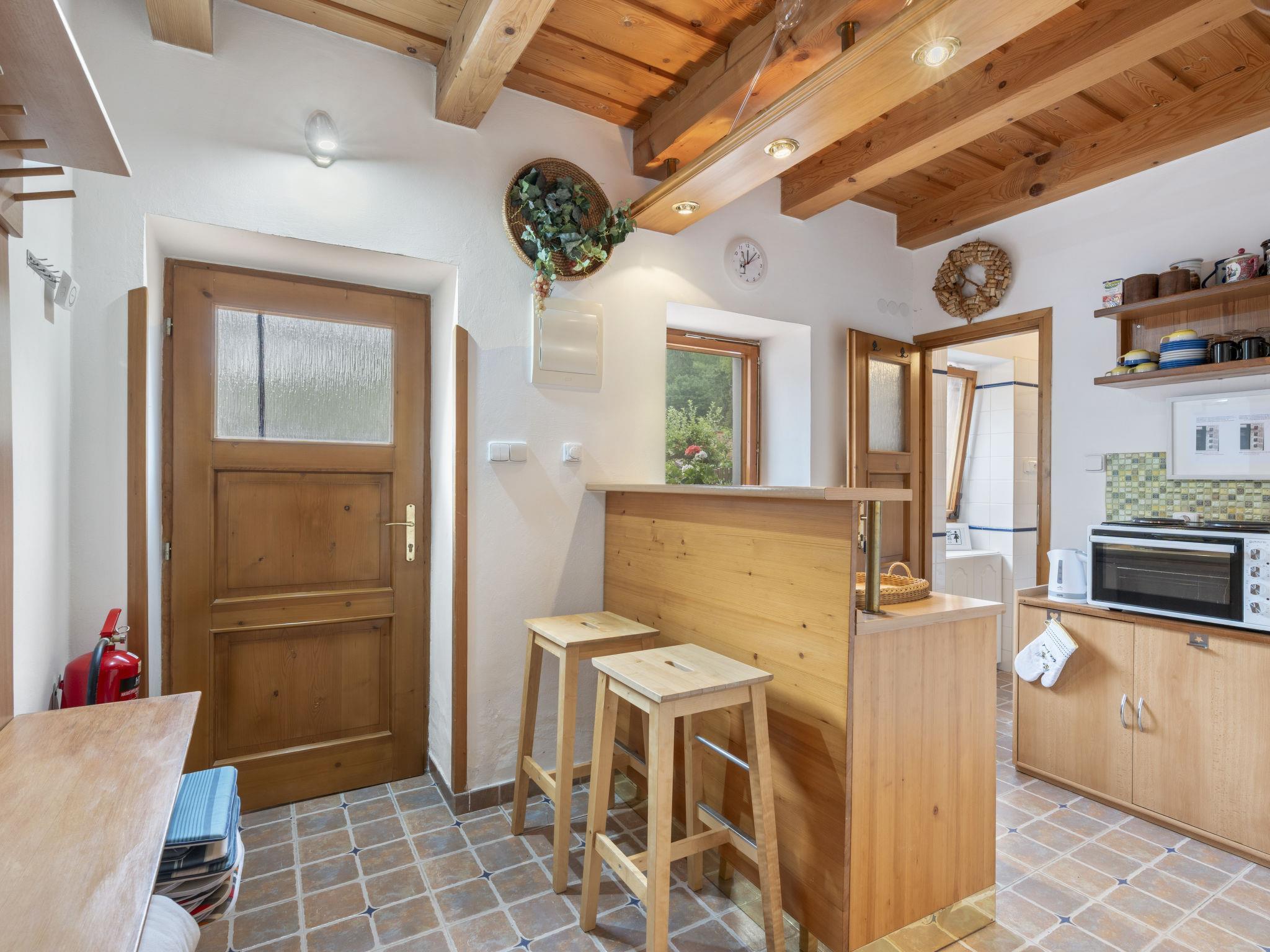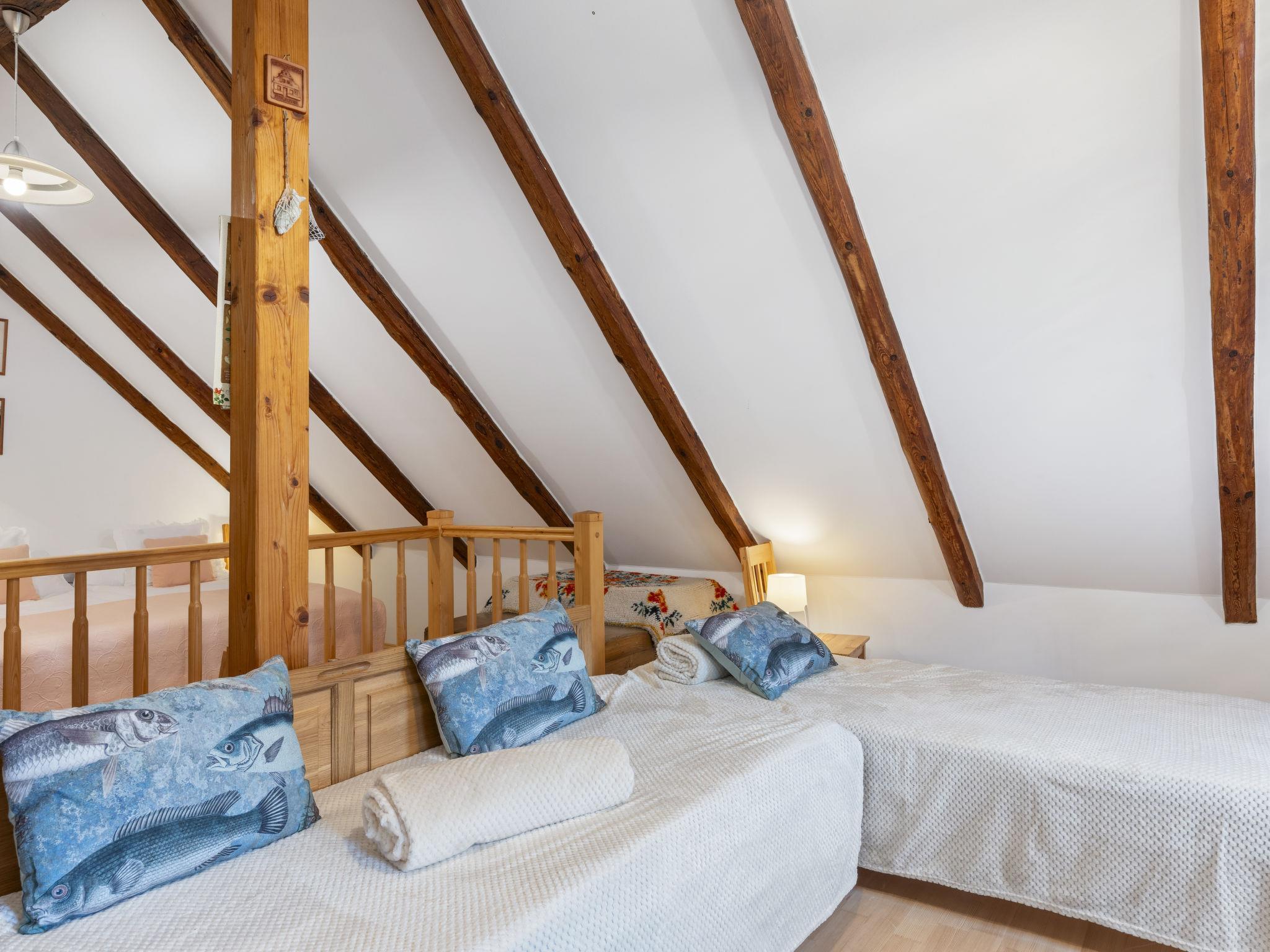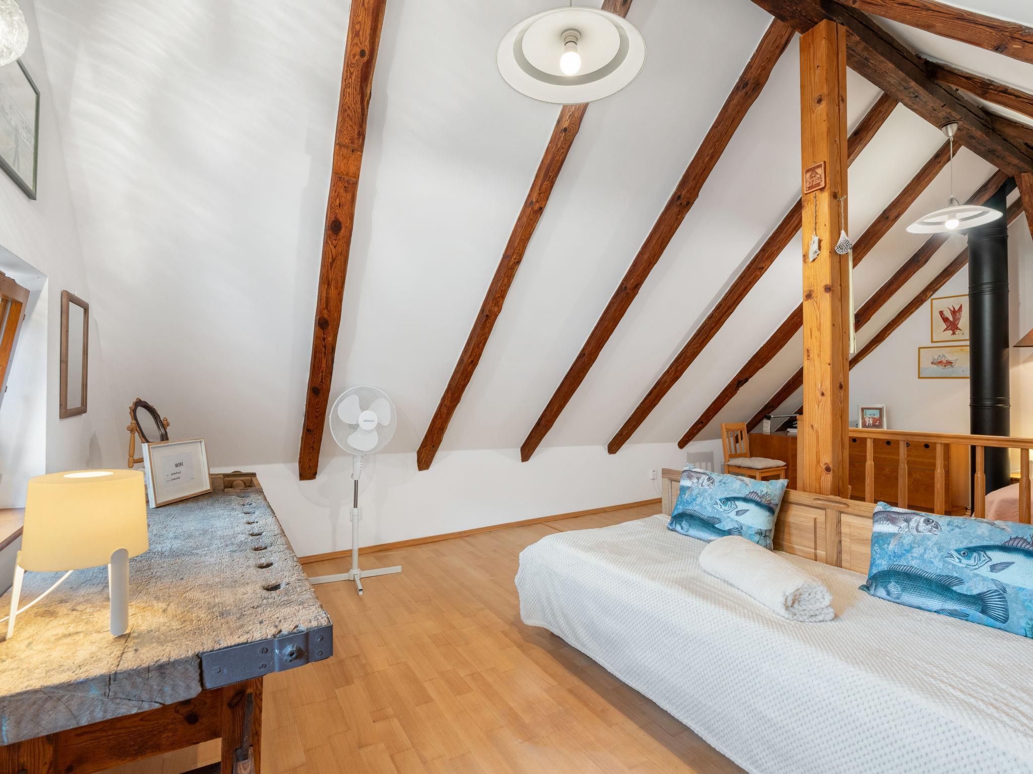 2-Zimmer-Haus 60 m2 auf 2 Stockwerken. Teilweise abgeschrägt, sehr schön und gemütlich eingerichtet: Wohn-/Esszimmer mit 1 Doppeldiwanbett, Sat-TV und Radio. Kleine Küche (2 Kochplatten, Backofen, Mikrowelle). Dusche/WC. Bodenheizung, Boiler (60 Liter). Obergeschoss: (steile Treppe) abgeschrägt 1 Zimmer mit 2 Betten und 1 franz. Bett. Terrasse. Zur Verfügung: Internet (WLAN, gratis). Bitte beachten: geeignet für Familien. Nichtraucher-Unterkunft. Feuerlöscher.