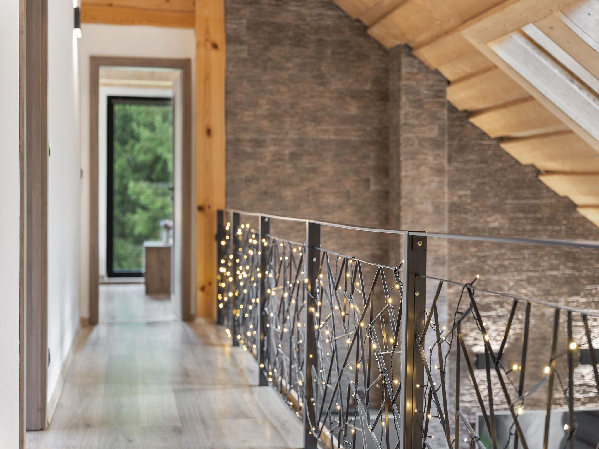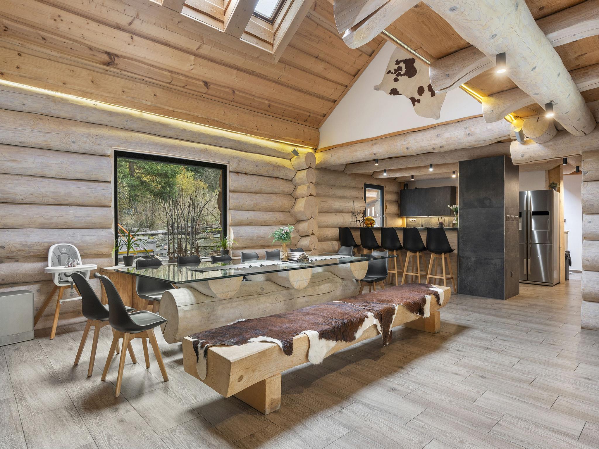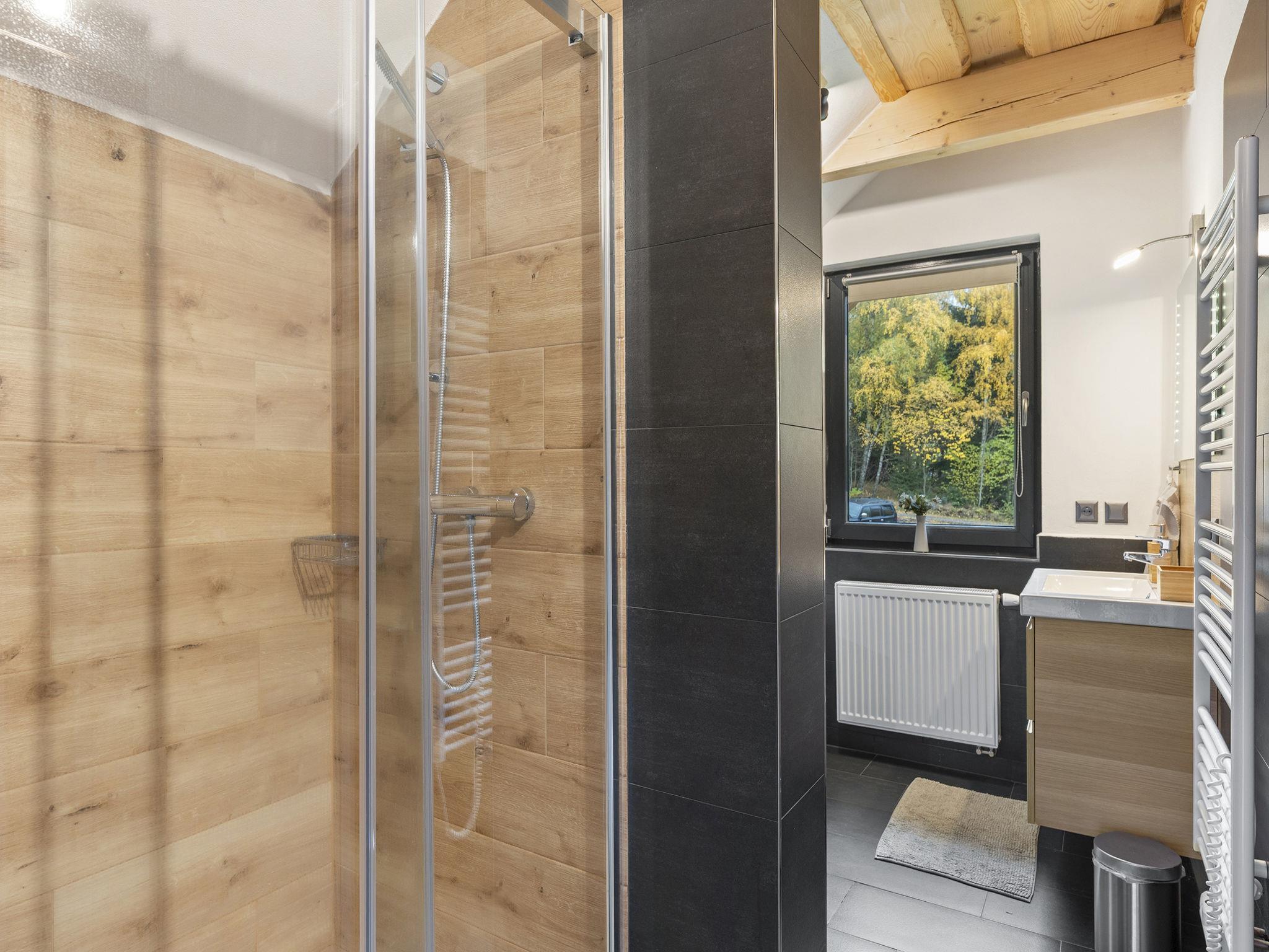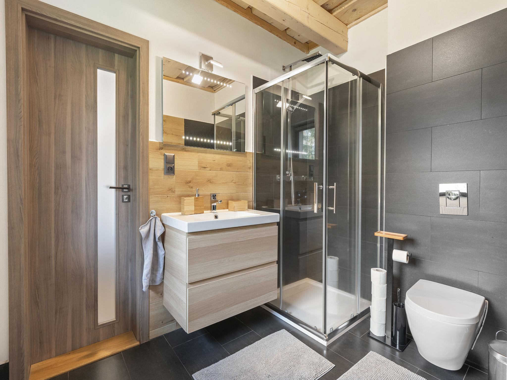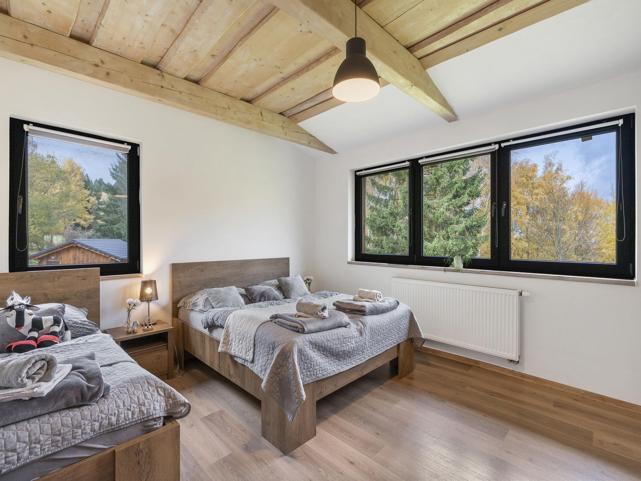 8-Zimmer-Chalet 300 m2 auf 2 Stockwerken. Geräumig, komfortabel und modern eingerichtet: offenes grosses Wohn-/Esszimmer mit offenem Kamin, Esstisch und sep. WC. Ausgang zur Terrasse. 1 Zimmer mit 1 Doppelbett und Dusche/WC. Wohnzimmer mit Panoramafenster mit offenem Kamin, Dusche/WC und Sprudelbad. Küche (4 Kochplatten, Backofen, Geschirrspüler, Wasserkocher, Mikrowelle, elektrische Kaffeemaschine) mit Bar. Fussbodenheizung. Obergeschoss: 1 Kinderzimmer mit 1 Bett und 1 Doppelbett. 1 Zimmer mit 1 Doppelbett und Dusche/WC. 1 Zimmer mit Dachfenster mit 1 Doppelbett. 1 Zimmer mit 1 Doppeldiwanbett und 1 Doppelbett. 1 Zimmer mit Panoramafenster mit 1 Doppeldiwanbett, 1 Doppelbett und Dusche/WC. Bad/Dusche/WC. Grosse Terrasse. Terrassenmöbel. Schöne Panoramasicht auf die Landschaft und den Wald. Zur Verfügung: Internet (Wireless LAN, gratis). Bitte beachten: geeignet für Familien. Rauchmelder, Feuerlöscher. Zapfanlage verfügbar (extra).