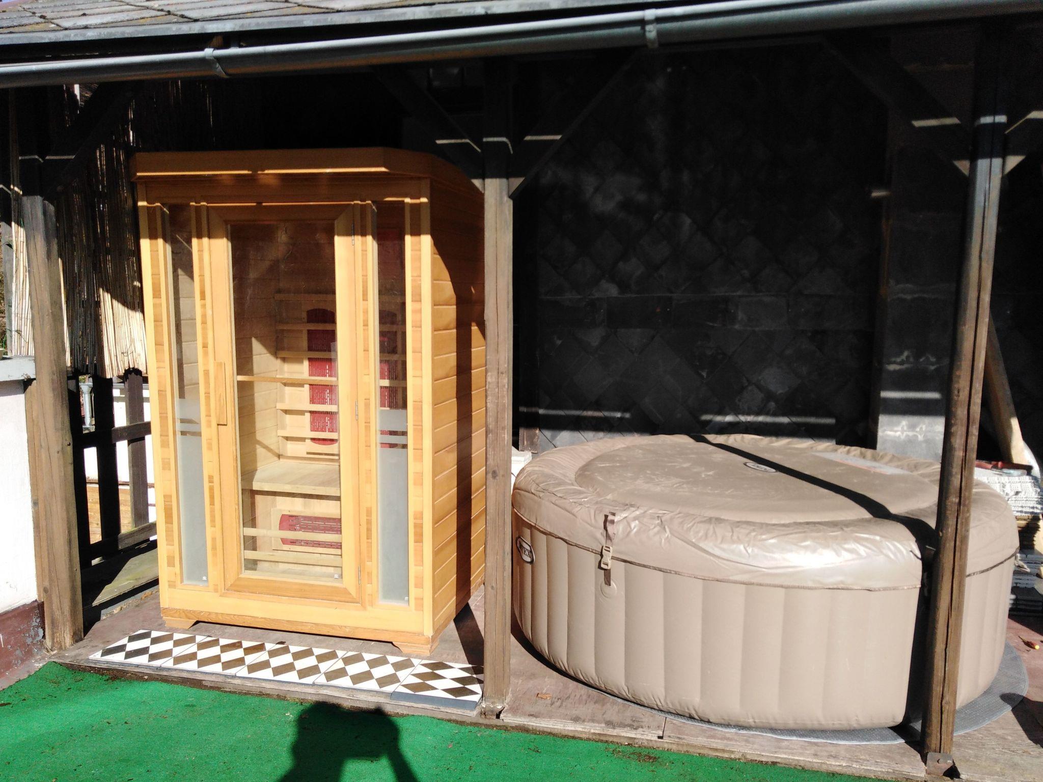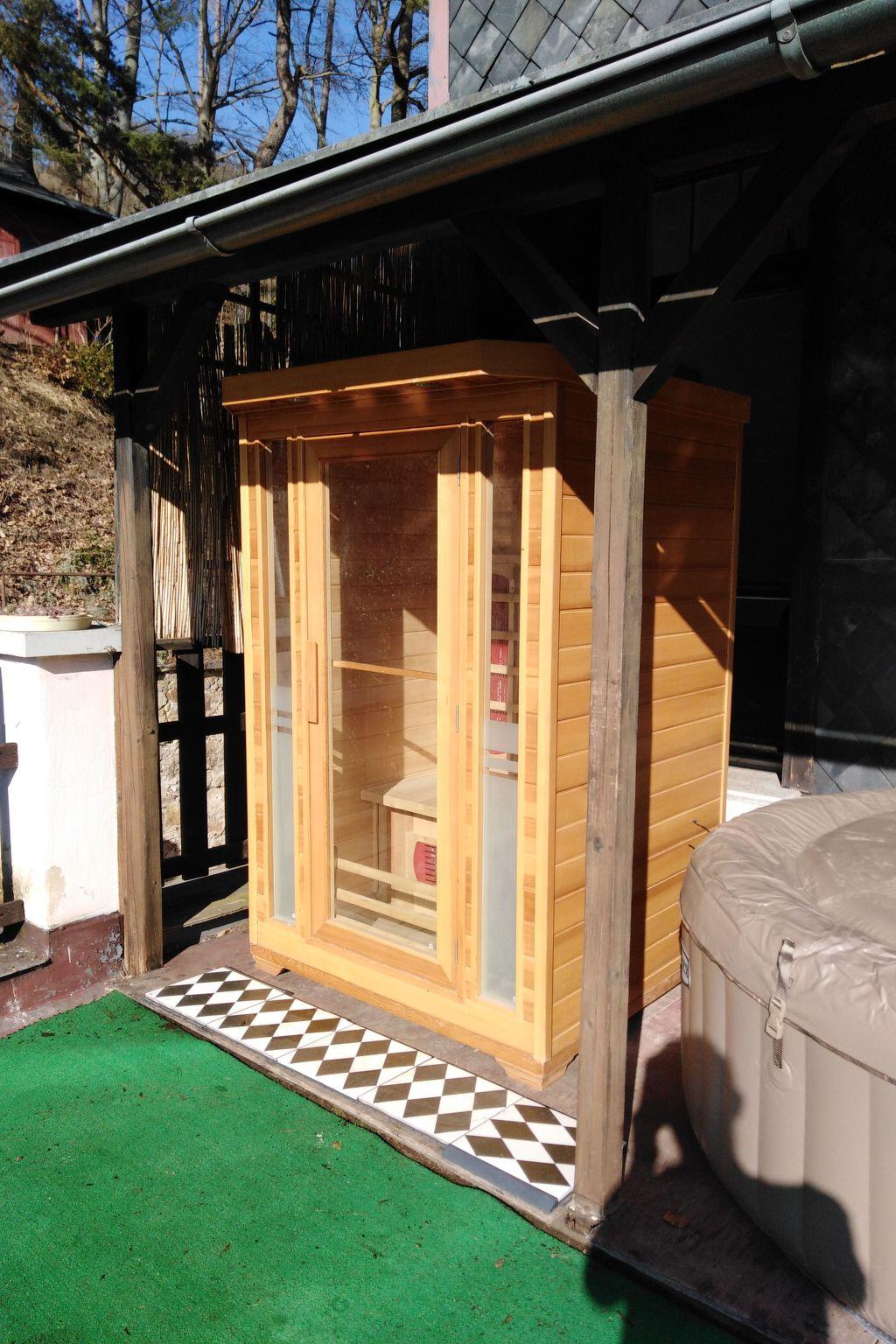 Auf der Terrasse befindet sich ein Gasgrill, und zum Entspannen gibt es eine heiße Röhre und eine Infrasauna.