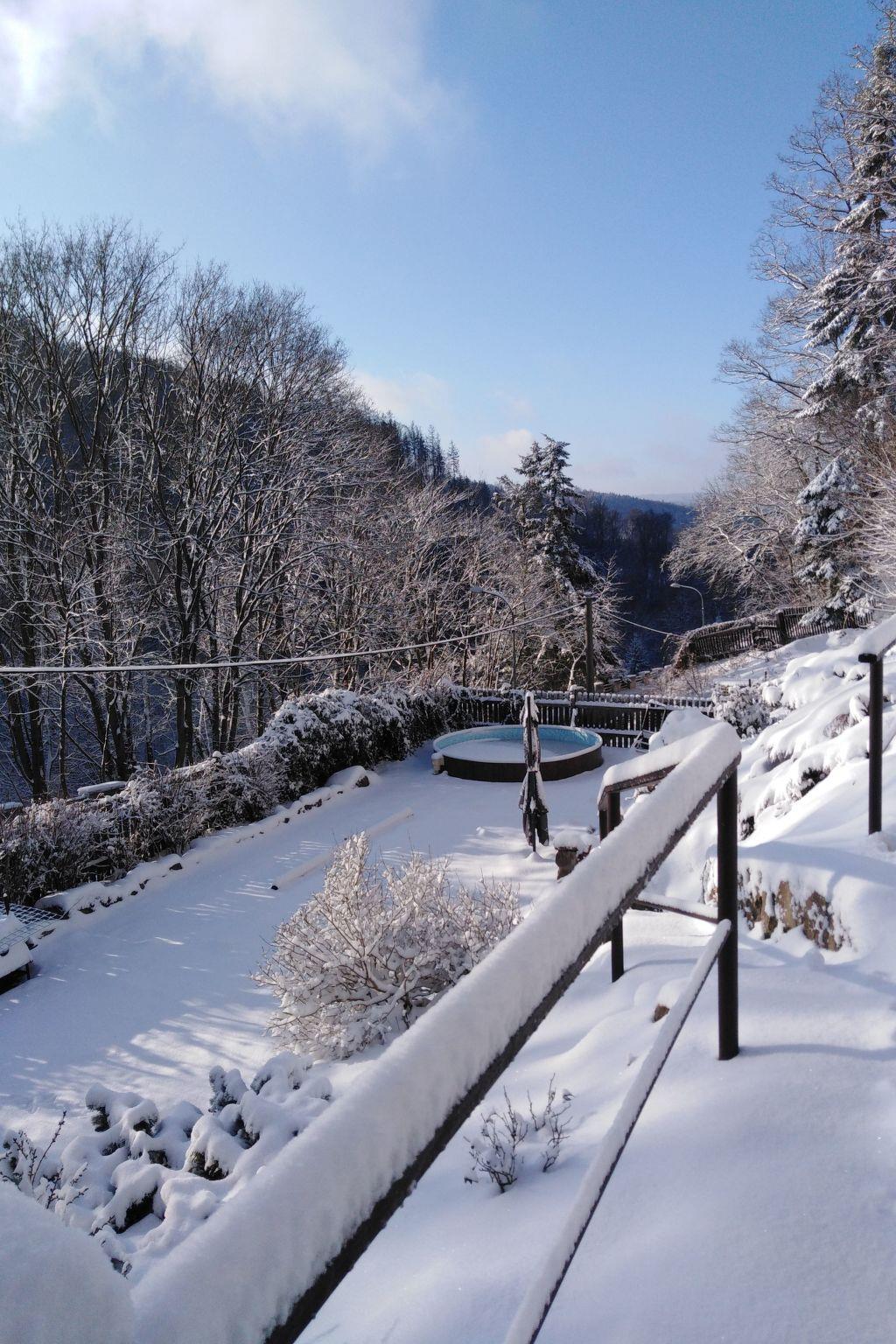 Der Garten hat einen Swimmingpool und einen direkten Zugang zum Wald.