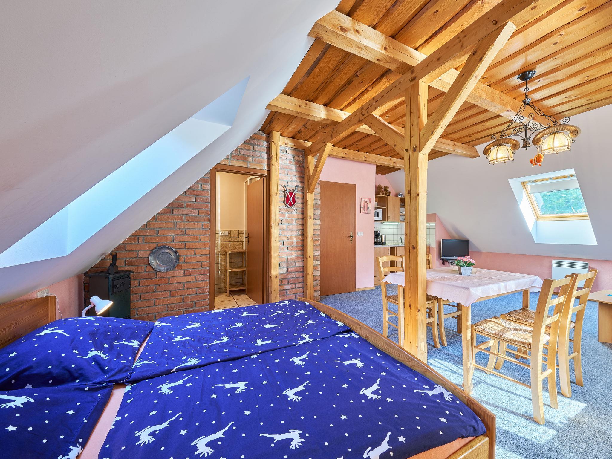 Chlívce 8 km von Hronov: Gemütlicher, freistehender Landsitz "Chlívce u Hronova", auf 2 Stockwerken. Ausserhalb des Ortes, ruhige, erhöhte Lage. Zur Mitbenutzung: Grundstück 1'000 m2, Schwimmbad rund (4,60 m Durchmesser, saisonale Verfügbarkeit: 01.Jul. - 31.Aug.). Laube, Gartenmöbel, Grill, Feuerstelle, Grillhaus, Kinderspielplatz, Parkplatz beim Haus. Einkaufsgeschäft 3.5 km, Einkaufszentrum 8 km, Restaurant 250 m, Bushaltestelle "Chlívce" 500 m, Bahnstation "Hronov, Cervený Kostelec" 8 km, Freibad 9 km, Hallenbad 35 km, Naturbadeteich 4 km. Skilift, Skipisten 200 m, Langlaufloipe 10 m. Nahe gelegene Sehenswürdigkeiten: Muzeum Aloise Jiráska/Hronov 8 km, Adršpašsko-teplické skály 17 km, Broumovské steny, Náchod 17 km, Ratiborice a Babiccino údolí 20 km, Broumov 28 km, Relaxpark Pec pod Snežkou 50 km. Bekannte Skigebiete sind gut erreichbar: Radvanice 10 km, Petrikovice 16 km, Mladé Buky 34 km, Janské Lázne 40 km. Bekannte Seen in der Umgebung sind gut erreichbar: vodní nádrž Rozkoš 25 m. Kinderhaus im Garten. Mahlzeiten können auf Anfrage in einem privaten Club (250 m entfernt) arrangiert werden. Dieses Ferienhaus kann als ganzes Haus oder in der Nebensaison separat für 4 voll ausgestattete Apartments gemietet werden.