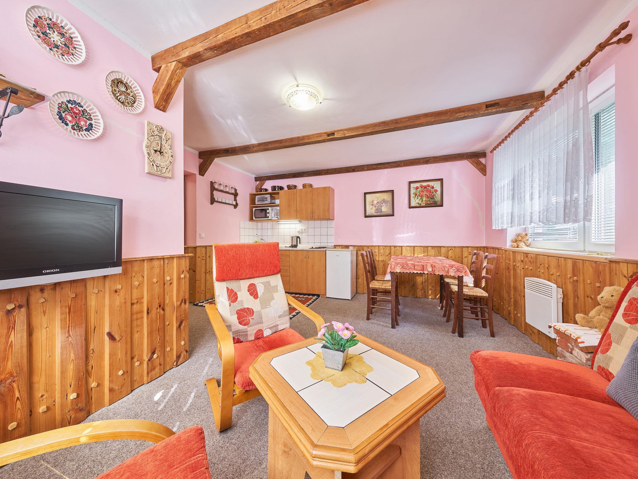 Chlívce 8 km von Hronov: Gemütlicher, freistehender Landsitz "Chlívce u Hronova", auf 2 Stockwerken. Ausserhalb des Ortes, ruhige, erhöhte Lage. Zur Mitbenutzung: Grundstück 1'000 m2, Schwimmbad rund (4,60 m Durchmesser, saisonale Verfügbarkeit: 01.Jul. - 31.Aug.). Laube, Gartenmöbel, Grill, Feuerstelle, Grillhaus, Kinderspielplatz, Parkplatz beim Haus. Einkaufsgeschäft 3.5 km, Einkaufszentrum 8 km, Restaurant 250 m, Bushaltestelle "Chlívce" 500 m, Bahnstation "Hronov, Cervený Kostelec" 8 km, Freibad 9 km, Hallenbad 35 km, Naturbadeteich 4 km. Skilift, Skipisten 200 m, Langlaufloipe 10 m. Nahe gelegene Sehenswürdigkeiten: Muzeum Aloise Jiráska/Hronov 8 km, Adršpašsko-teplické skály 17 km, Broumovské steny, Náchod 17 km, Ratiborice a Babiccino údolí 20 km, Broumov 28 km, Relaxpark Pec pod Snežkou 50 km. Bekannte Skigebiete sind gut erreichbar: Radvanice 10 km, Petrikovice 16 km, Mladé Buky 34 km, Janské Lázne 40 km. Bekannte Seen in der Umgebung sind gut erreichbar: vodní nádrž Rozkoš 25 m. Kinderhaus im Garten. Mahlzeiten können auf Anfrage in einem privaten Club (250 m entfernt) arrangiert werden. Dieses Ferienhaus kann als ganzes Haus oder in der Nebensaison separat für 4 voll ausgestattete Apartments gemietet werden.
