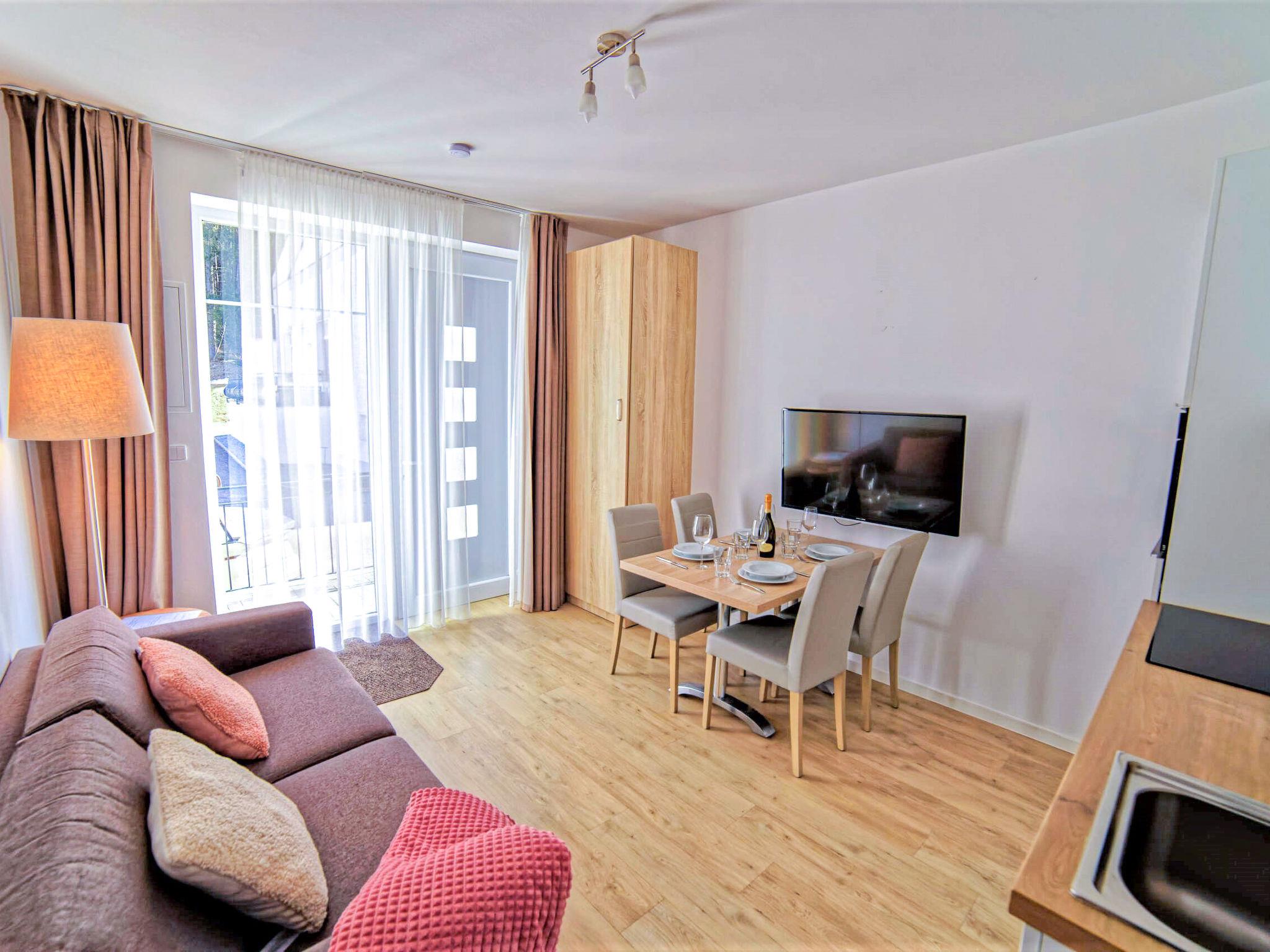 "Lakeside Village 5", 1-Zimmer-Studio 32 m2, im Erdgeschoss. Objekt geeignet für 2 Erwachsene + 2 Kinder. Komfortabel und gemütlich eingerichtet: Wohn-/Schlafzimmer mit 1 Doppeldiwanbett und 1 Doppelbett. Kochnische (4 Kochplatten, Backofen, Geschirrspüler, Wasserkocher, Mikrowelle, elektrische Kaffeemaschine) mit Esstisch, Sat-TV. Dusche/WC. Bodenheizung. Terrasse. Terrassenmöbel. Zur Verfügung: Internet (WLAN, gratis). Geeignet für Familien. Maximal 1 Haustier/Hund erlaubt.