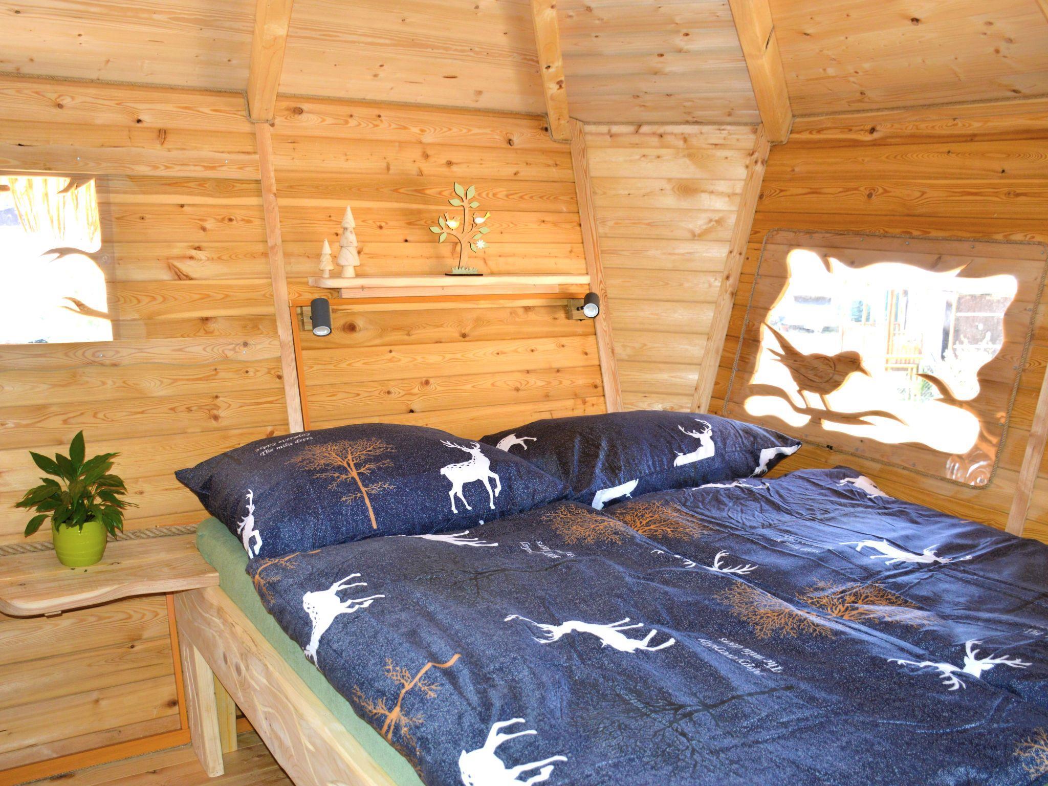 "Treehouse 2", 1-Zimmer-Landhaus. Gemütlich eingerichtet: Wohn-/Schlafzimmer mit 1 x 2 Etagenbetten, 1 Doppelbett. Kleine Kochnische). Sehr schöne Sicht auf den Wald. Zur Verfügung: Internet (WLAN, gratis). Bitte beachten: Kühlschrank ohne Gefrierfach, Nichtraucher-Haus. Es gibt KEIN WASSER im Haus – Trinkwasser ist in der Nähe. Toilette in der Nähe. Duschen gegen Gebühr.