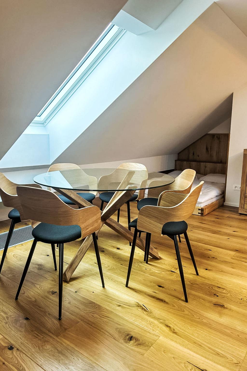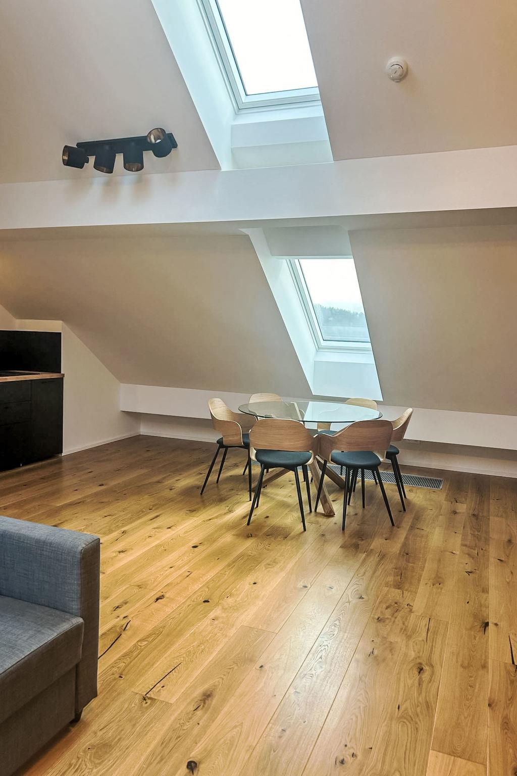 "Ski&Bike Siréna 4+2", 1-Zimmer-Wohnung auf 2 Stockwerken. Objekt geeignet für 4 Erwachsene + 2 Kinder. Eingang. Ausgang zum Balkon. Obergeschoss: abgeschrägtes Wohn-/Schlafzimmer mit 4 Betten, 1 Doppeldiwanbett und TV. Kochnische (Backofen, 4 Glaskeramikplatten, Mikrowelle, Tiefkühler, elektrische Kaffeemaschine) mit Esstisch. Dusche/WC. Balkon. Balkonmöbel. Zur Verfügung: Internet (Wireless LAN, gratis). Parkplatz (überdacht). Bitte beachten: geeignet für Familien. Nichtraucher-Unterkunft.