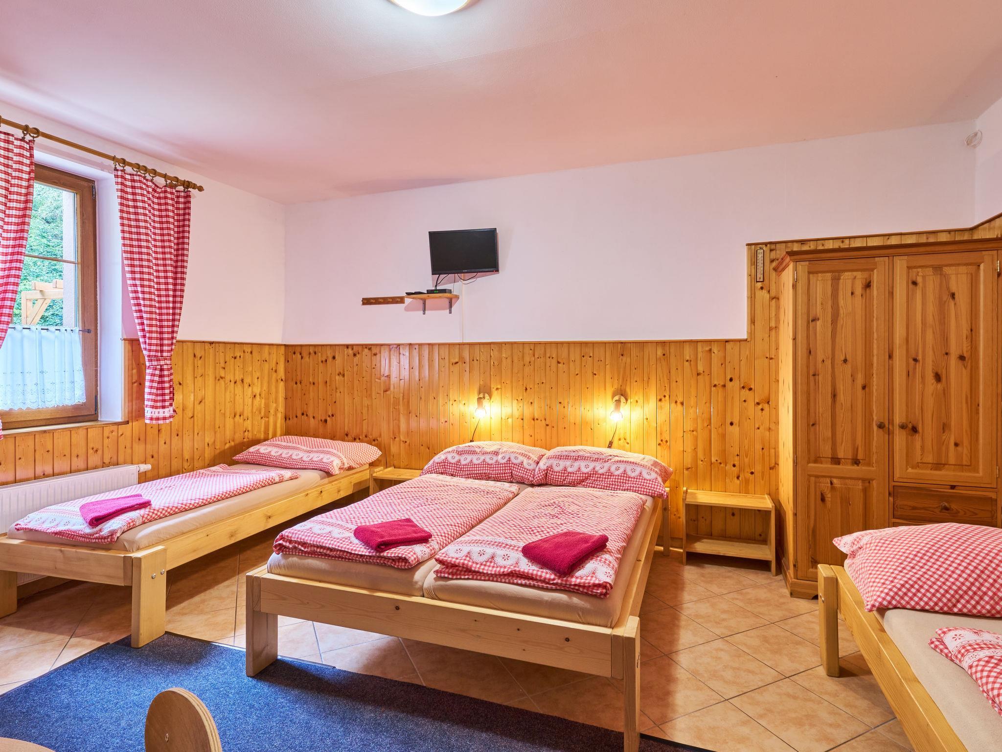 "U Švýcarského dvora III", 1-Zimmer-Wohnung 27 m2, im Erdgeschoss. Zweckmässig und gemütlich eingerichtet: 1 Zimmer mit 2 Betten, 1 Doppelbett, Esstisch und Sat-TV. Kochnische (2 Kochplatten, Wasserkocher, Mikrowelle). Dusche/WC. Heizung. Sicht auf den Garten. Zur Verfügung: Internet (WLAN, gratis). Bitte beachten: Nichtraucher-Unterkunft. Rauchmelder, Feuerlöscher.