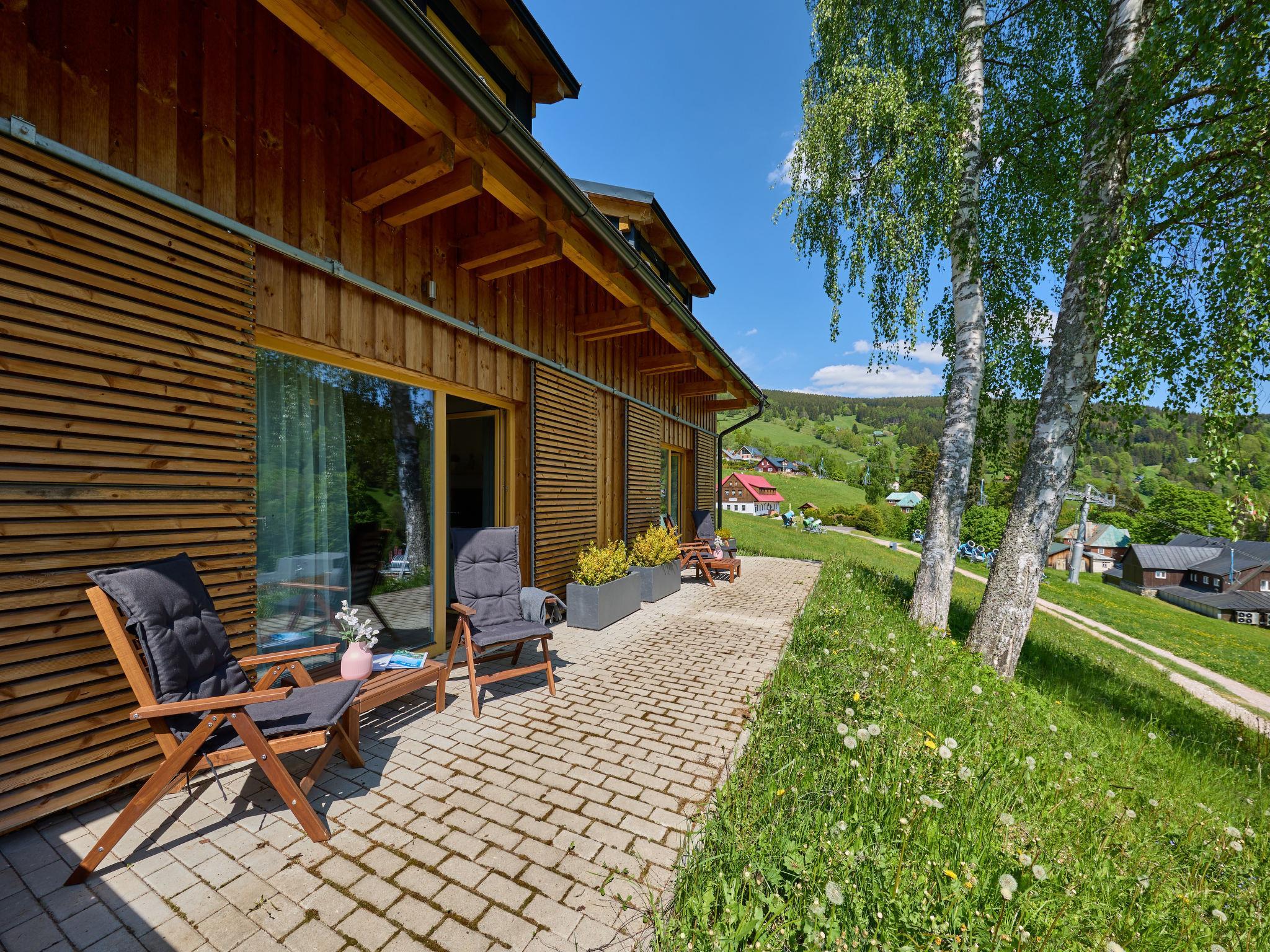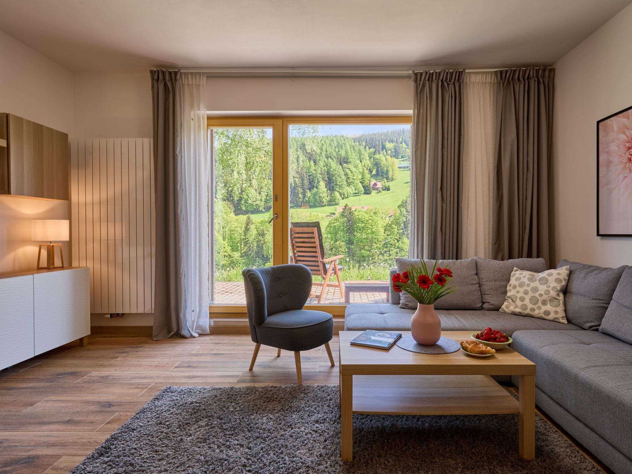 "Ski-In Ski-Out Mountain Duplex Portášky2", 2-Zimmer-Maisonette-Wohnung 65 m2. Hell, modern eingerichtet: Wohnzimmer mit Sat-TV. Kochnische (2 Glaskeramikplatten, Toaster, Wasserkocher, Mikrowelle, elektrische Kaffeemaschine) mit Esstisch. Sep. WC. Heizung. Obergeschoss: 1 Zimmer mit 2 Betten und 1 Doppelbett. Dusche/WC. Terrasse. Terrassenmöbel. Schöne Sicht auf die Landschaft. Zur Verfügung: Haartrockner. Internet (WLAN, gratis). Bitte beachten: geeignet für Familien. Nichtraucher-Unterkunft. Maximal 1 kleines Haustier/Hund erlaubt.