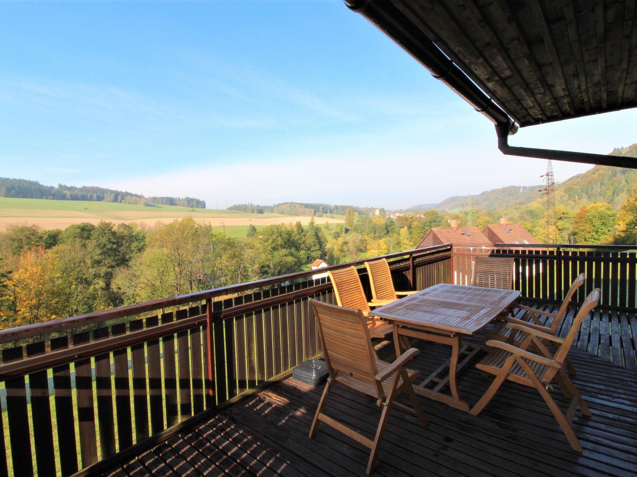 "Stárkov 6", 4-Zimmer-Haus 100 m2 auf 2 Stockwerken. Hell, vollständig renoviert im Jahre 2015, gemütlich eingerichtet: Wohnzimmer mit Schwedenofen, Sat-TV und Flachbildschirm. Ausgang zur Terrasse. Offene Küche (Geschirrspüler, 4 Induktionskochplatten, Toaster, Wasserkocher, Mikrowelle, Tiefkühler, elektrische Kaffeemaschine) mit Esstisch. Dusche/WC. E-Heizung. Obergeschoss: 1 Zimmer mit 2 Betten. 1 Zimmer mit 2 Betten. 1 Zimmer mit 1 Doppelbett und Sat-TV. Grosse Terrasse. Terrassenmöbel. Sehr schöne Panoramasicht auf das Tal und die Landschaft. Zur Verfügung: Waschmaschine, Bügeleisen, Kinderhochstuhl, Babybett. Internet (WLAN, gratis). Parkplatz (2 Autos) beim Haus. Bitte beachten: geeignet für Familien. Nichtraucher-Haus.