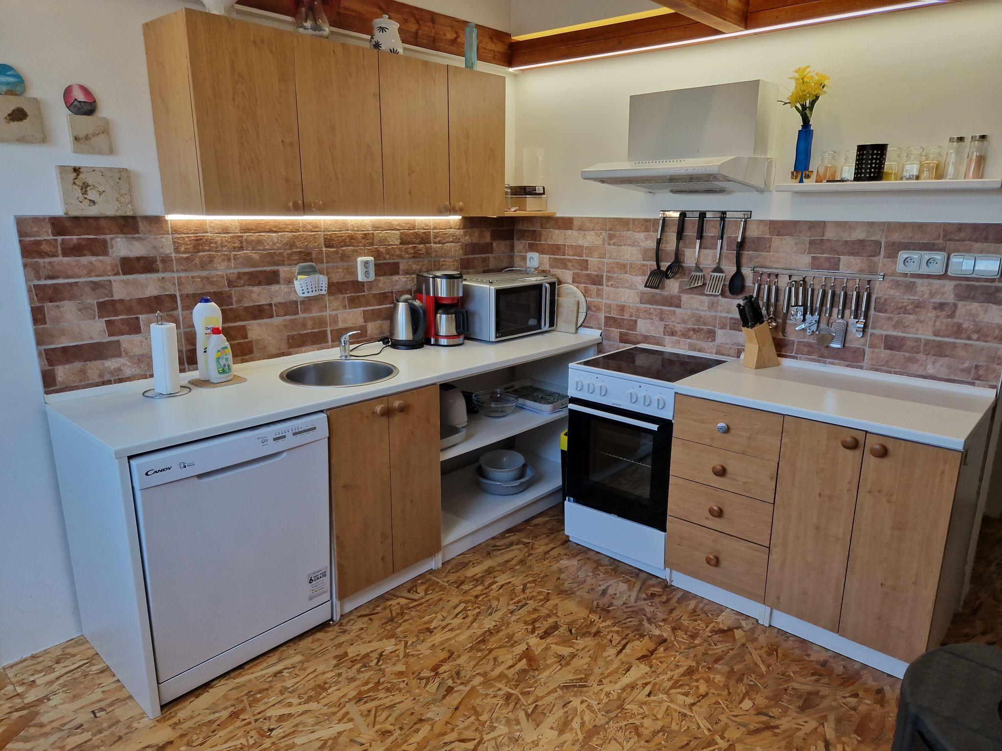 3-Zimmer-Haus. Wohn-/Esszimmer mit Holzofen. 1 Zimmer mit 1 Doppelbett. Durchgangszimmer mit 1 Bett und 1 x 2 Etagenbetten. Offene Küche (Backofen, Geschirrspüler, 4 Glaskeramikplatten, Wasserkocher, Mikrowelle, elektrische Kaffeemaschine) mit Küchenblock. Dusche, sep. WC. Holzheizung. Zur Verfügung: Internet (Wireless LAN, gratis). Bitte beachten: geeignet für Familien. Nichtraucher-Haus.