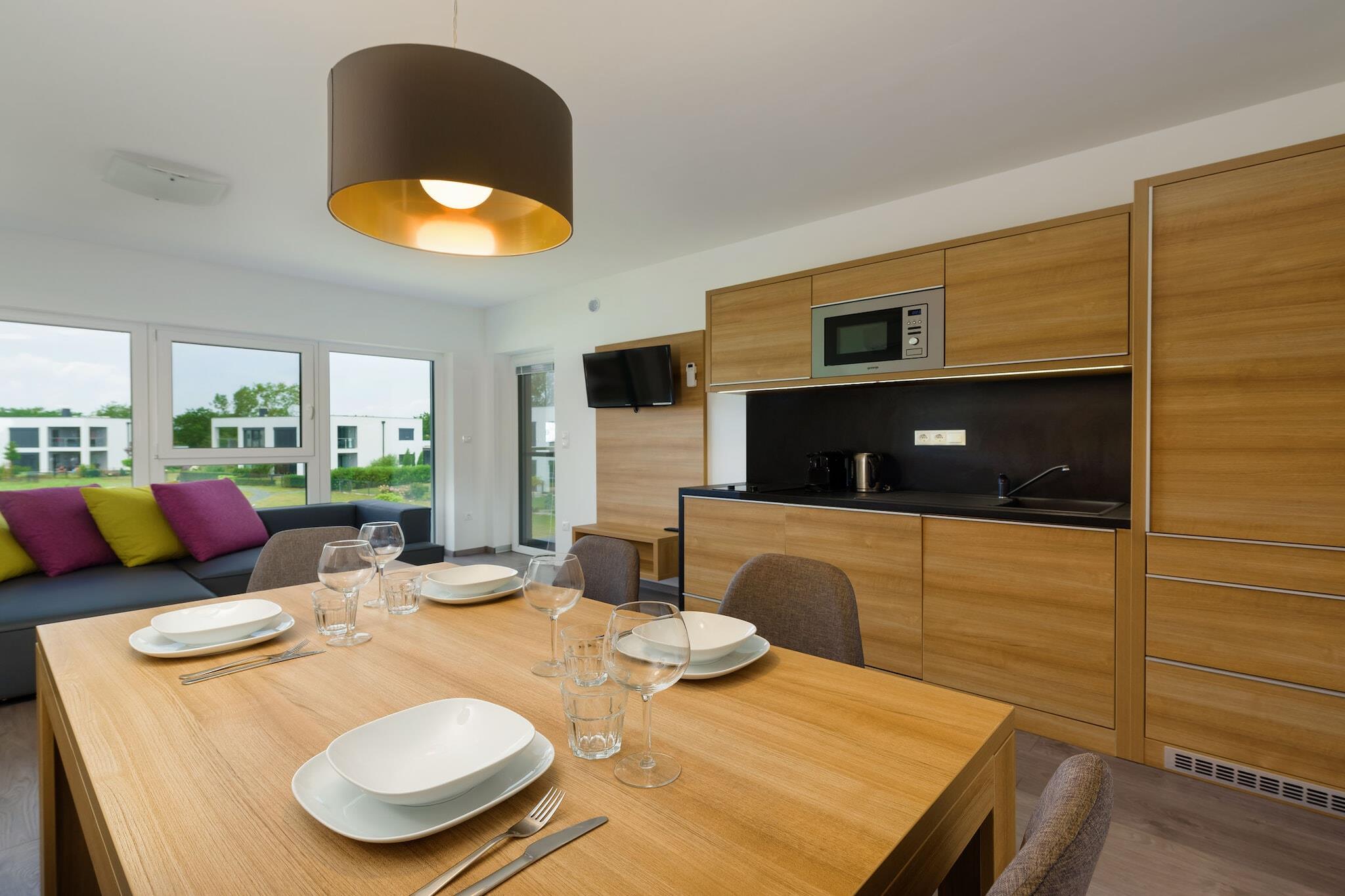 In der 1. Etage: (Wohnzimmer(Doppelschlafcouch, TV, Balkon), offene Küche(Esstisch, Wasserkocher, Kochherd(2 Kochplatten), Kaffeemaschine(cups), Kombi-Mikrowelle, Spülmaschine, Kühl-/Gefrierkombination), Schlafzimmer(Doppelbett), Schlafzimmer(Doppelbett), Badezimmer(Dusche, Waschbecken, Toilette)) Parkplatz, Pool(Gemeinschaftliche Nutzung mit anderen Gästen, Naturschwimmteich)