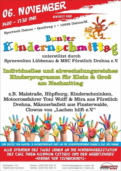 Die Intention dahinter ist es den Kinder das Kind sein zu geben, was sie brauchen. Weg von Social Media Postings und X-Box "Baller-Spielen". Sie dürfen mit allen Spielzeugen spielen, lachen, schreien und sich austoben zusammen mit ihren Freunden. Für einen Moment können sie so alle sozialen oder anderen Probleme vergessen. Es gibt eine tolle Mitmach-Show (Tullio), ein Glücksrad eine Clown-Show, eine Hüpfburg, Pferdereiten, eine Fussball Schulung durch Paul Pflug, Kinderschminken, eine Mal- und Bastelstraße, ein Kostüm-Fotoshooting, viele Spielgeräte und ein kleines Karussell. Zur Unterhaltung begeistert das Finsterwalder Männerballett die Eltern und Kinder mit einer tollen Tanzshow. Außerdem werden die kleinen und großen Gäste mit Kuchen, Süßigkeiten und Getränken versorgt.